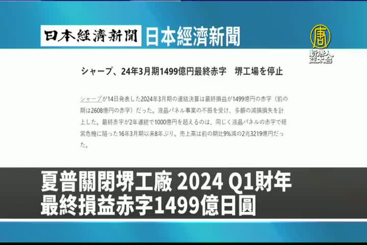 【新唐人亞太台 2024 年 05 月 15 日訊】來看到日本經濟新聞報導:夏普經營狀況惡化,關閉?工廠,2024 Q1財年最終損益赤字1499 億日圓。