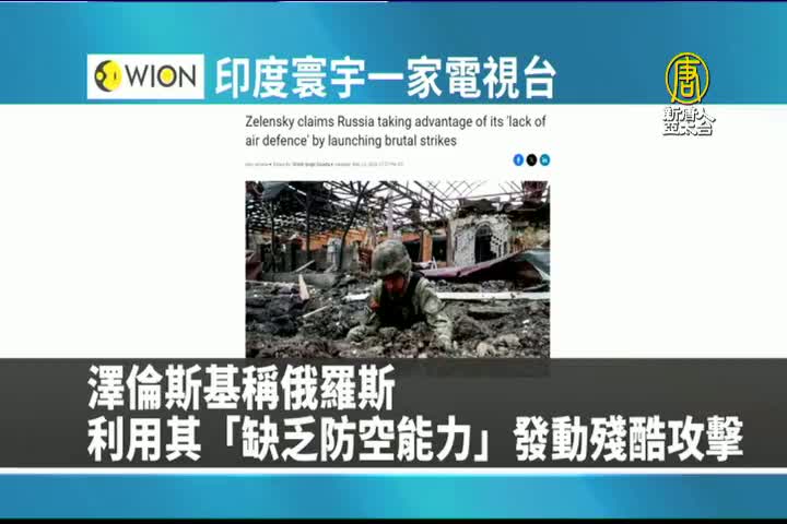 【新唐人亞太台 2024 年 05 月 24 日訊】最後是印度寰宇一家電視台報導:烏克蘭總統澤倫斯基表示,俄羅斯利用烏克蘭缺乏防空系統的機會,對前線城鎮發動「殘酷」攻擊。