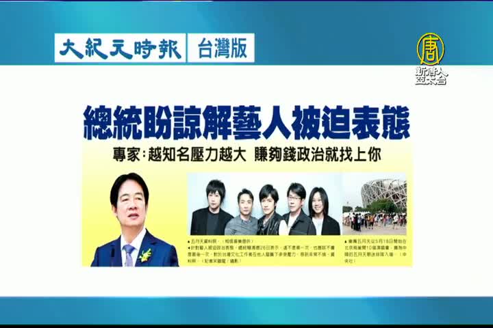 【新唐人亞太台 2024 年 05 月 27 日訊】接著看到大紀元時報台灣版報導:總統盼諒解藝人被迫表態。專家表示,越知名壓力越大,賺夠錢政治就找上你。