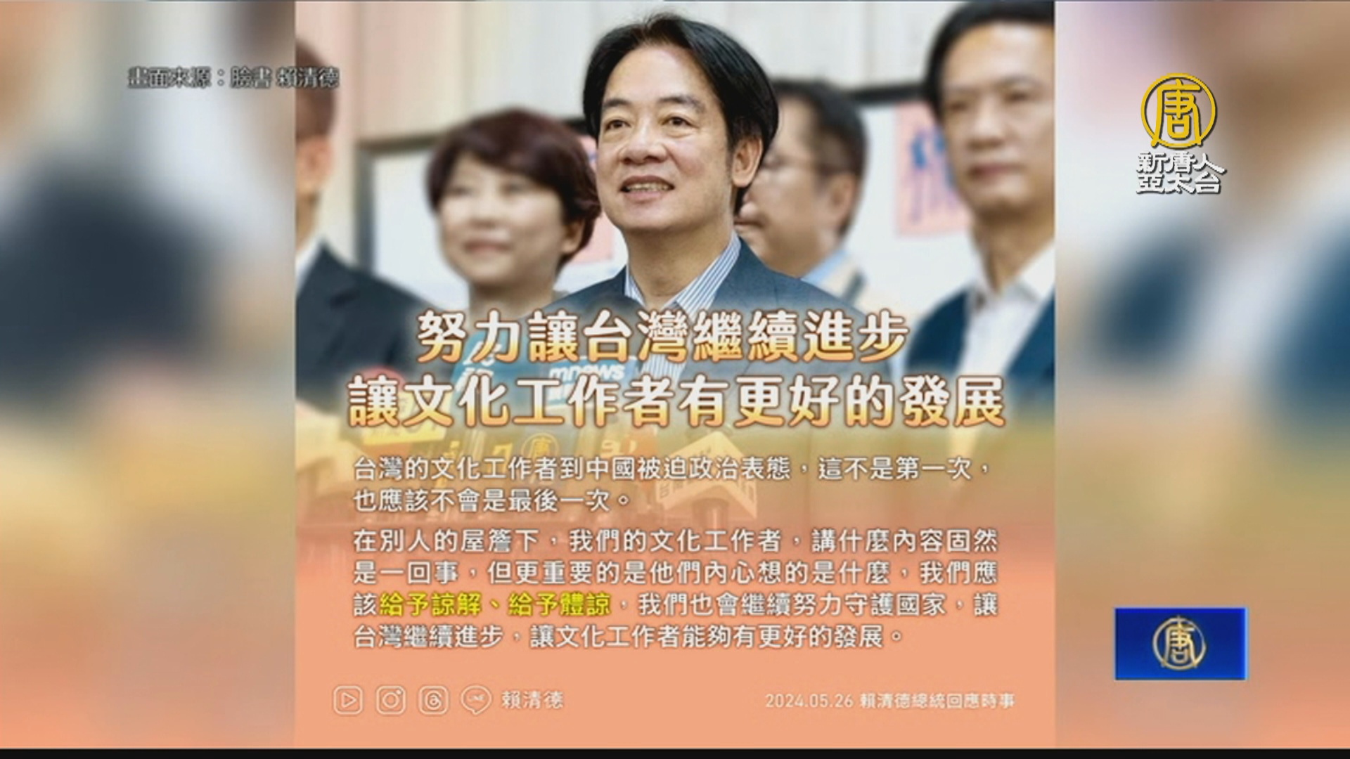 【新唐人亞太台 2024 年 05 月 27 日訊】520後台灣迎來新政府,然而,中共再拿台灣藝人開刀,多名台灣藝人集體在官方微博發出統戰圖片,對此,總統賴清德發文指出,每一次,台灣的文化工作者在他人的屋簷下承受壓力,我都感到非常不捨,更重要的是,他們內心想的是什麼,也請國人對此能夠了解,給予諒解和體諒。我們要持續團結努力,守護國家,讓台灣繼續進步,讓文化工作者能夠有更好的發展,國家不斷向前邁進。