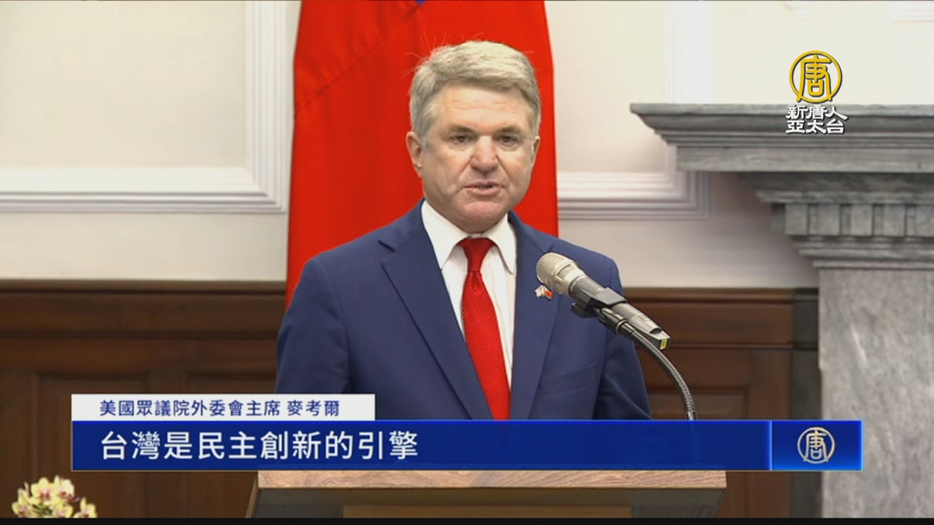 美國眾議院外委會主席 麥考爾:「首先讓我說一句,我們愛台灣。台灣是民主創新的引擎。在給予台灣人民自由和民主後,這個小島轉變成了科技強國。我們也致力於解決兩國之間的課稅問題,為台灣帶來更多的美國投資,反之亦然。美國人和台灣人的並肩合作,可以推進人工智慧和量子計算等新興技術,促進我們的繁榮,並解決許多社會問題。」