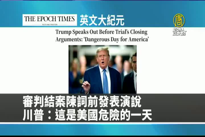 【新唐人亞太台 2024 年 05 月 29 日訊】首先來看到美國大紀元英文版報導:審判結案陳詞前發表演說,前美國總統川普表示,這對美國來說是非常危險的一天。