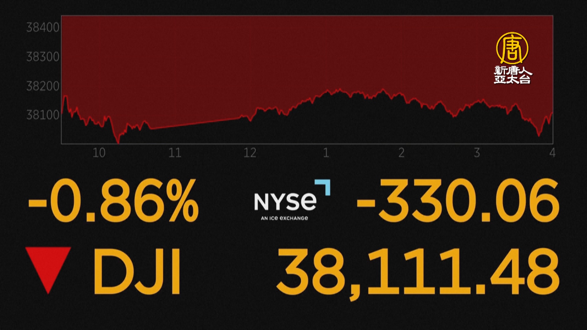 美股道瓊指數下跌 330.06 點,或 0.86%,收 38,111.48 點。