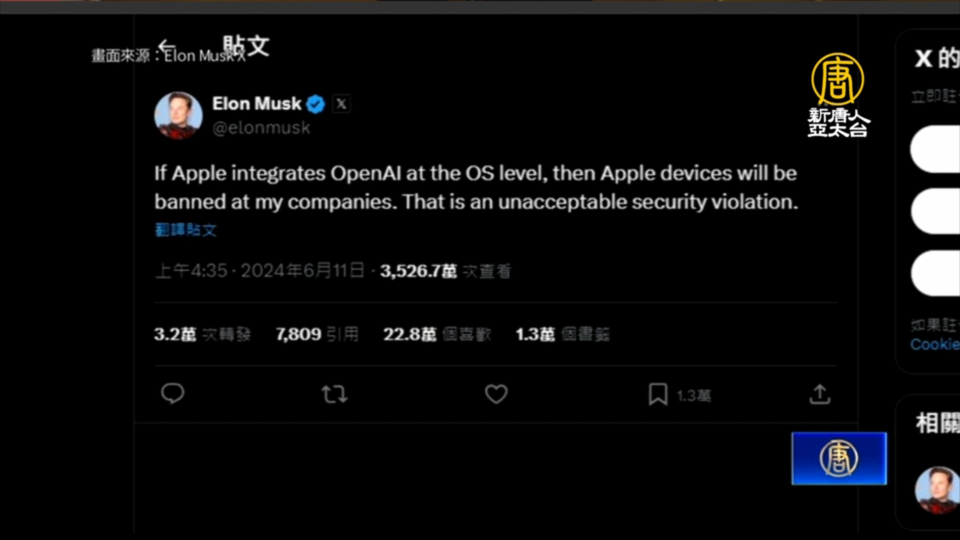 【新唐人亞太台 2024 年 06 月 11 日訊】蘋果全球開發者大會,宣布將AI聊天機器人ChatGPT整合到作業系統中,引起特斯拉執行長馬斯克強烈不滿,他在社群平台寫到,如果蘋果在作業系統整合ChatGPT,他旗下的所有公司都將禁止使用蘋果設備,這是不可接受的安全危害。馬斯克表示,蘋果不做自己的AI,而一旦他們把你的資料交給OpenAI,根本不知道實際上會發生什麼事。