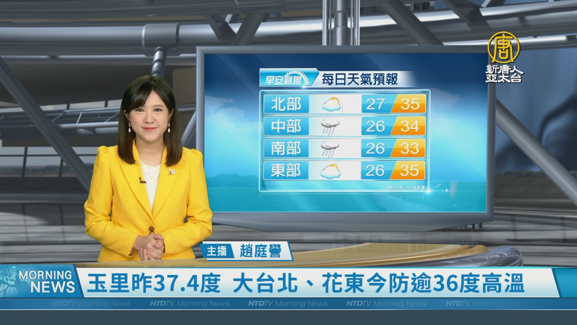 【新唐人亞太台 2024 年 06 月 13 日訊】歡迎您收看6月13日的早安新唐人,我是趙庭譽,先來帶您關心天氣。受到西南風沉降影響,昨天花蓮玉里出現攝氏37.4度高溫,今天大台北、花東地區,仍要留意局部36度以上高溫,南部、各山區也要留意可能有局部大雨發生。帶您一起來看到國際媒體重要訊息。