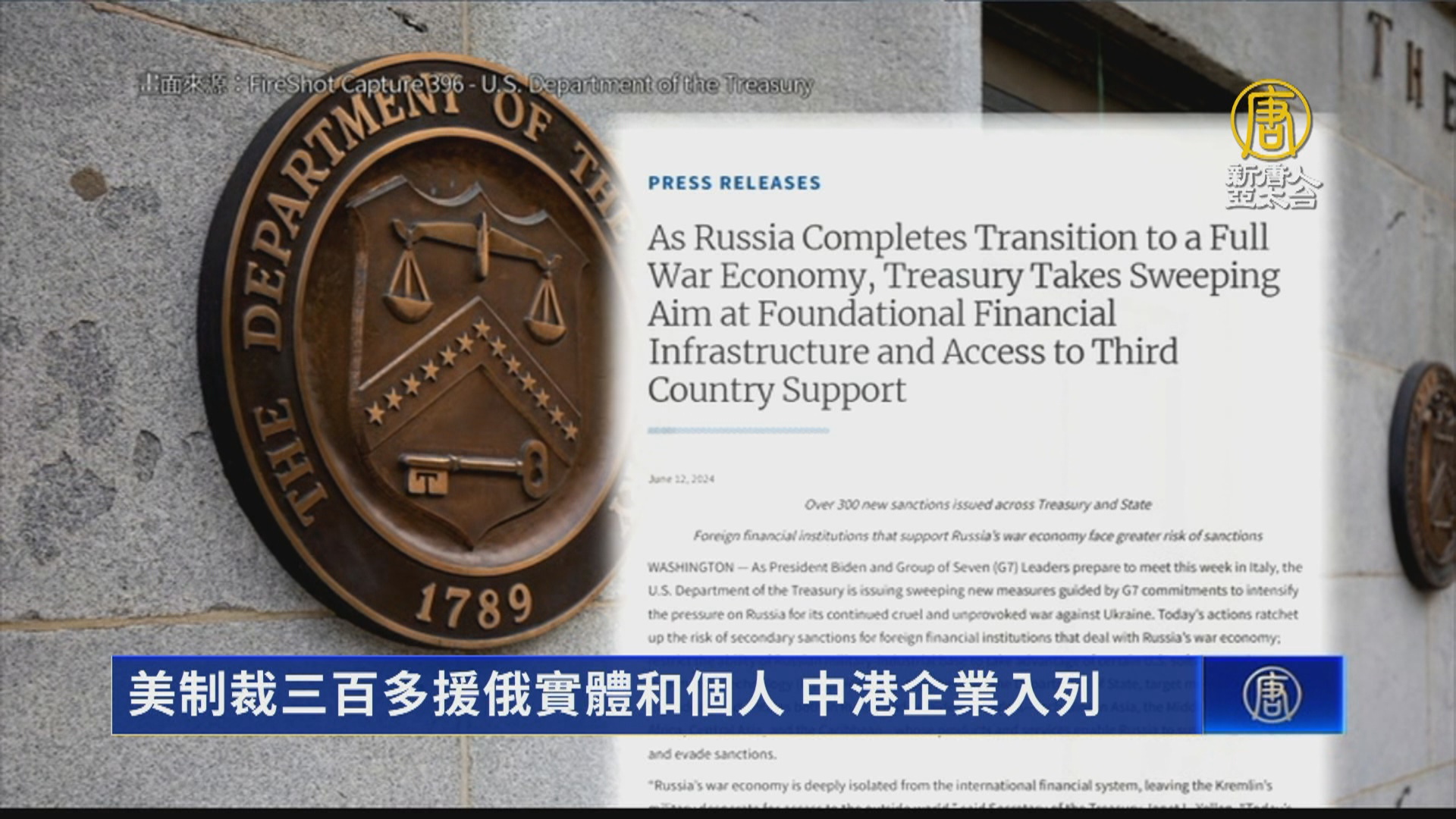 【新唐人亞太台 2024 年 06 月 13 日訊】G7峰會前夕,美國擴大對俄羅斯施壓,宣布制裁援助俄羅斯的三百多個全球實體和個人,當中,共有7家中、港企業,因向俄羅斯運送價值數百萬美元的材料而入列,包括可以用於俄羅斯武器系統的產品。美方指出,這項行動目的是讓俄羅斯更難取得關鍵技術。