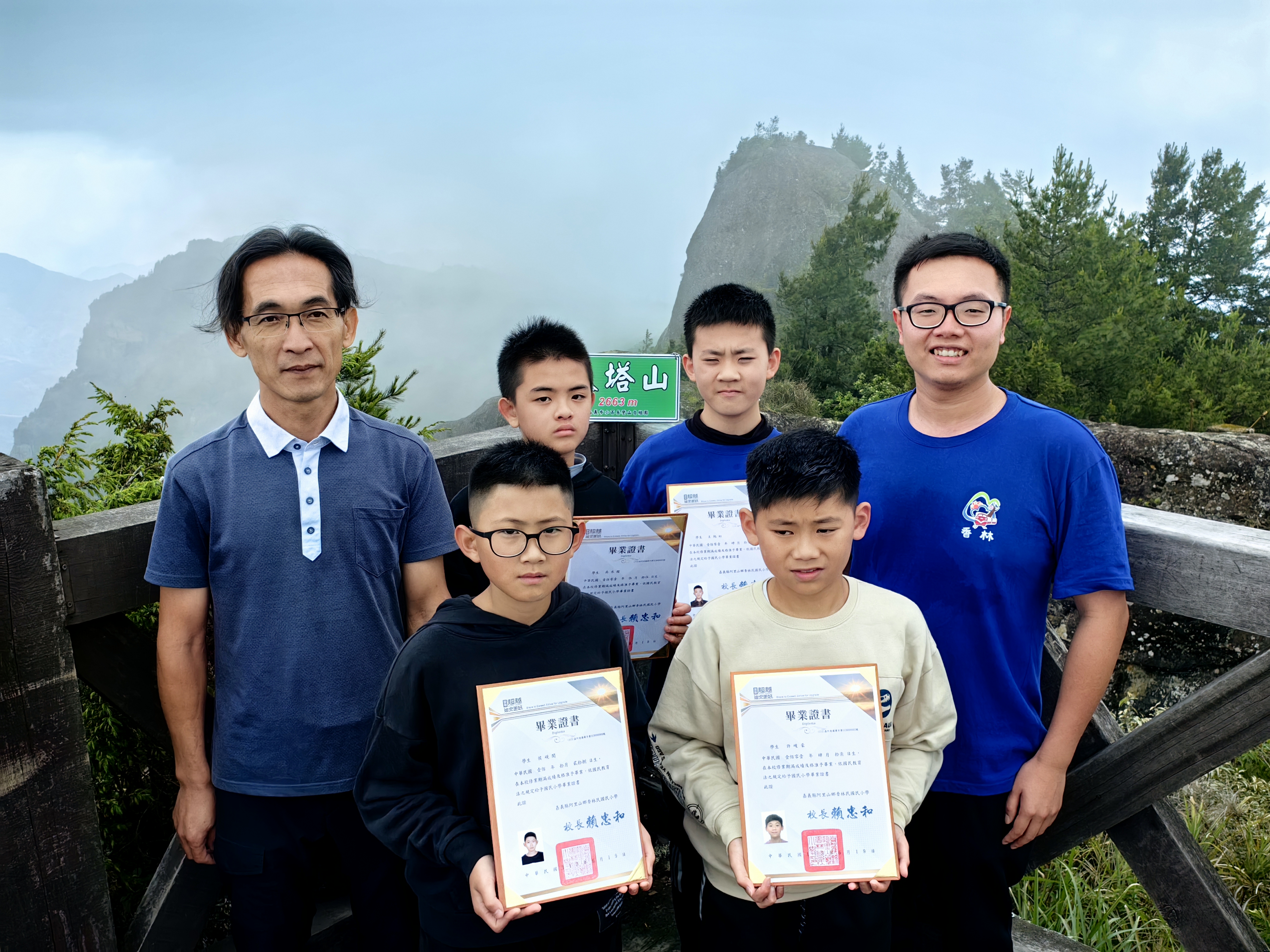 嘉義縣阿里山香林國小四名應屆畢業生,登上大塔山後,校長賴忠和頒發證書並與畢業生合影。(香林國小提供)