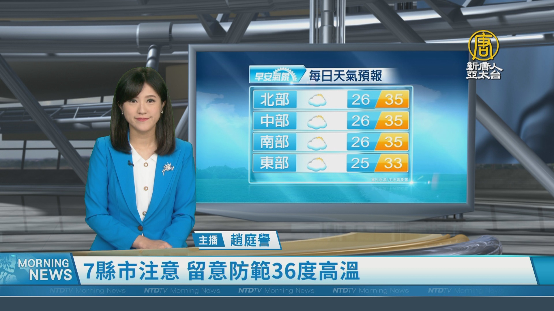【新唐人亞太台 2024 年 06 月 20 日訊】歡迎您收看6月20日的早安新唐人,我是趙庭譽,先來帶您關心天氣。氣象署發出高溫警報,今天中午前後彰化縣、雲林縣、台南市、屏東縣地區為橙色燈號,有連續出現36度高溫的機率,而高雄市、花蓮縣以及台東縣地區也可能會出現36度高溫。提醒觀眾朋友出門要留意防曬,並多補充水分,帶您一起來看到國際媒體重要訊息。