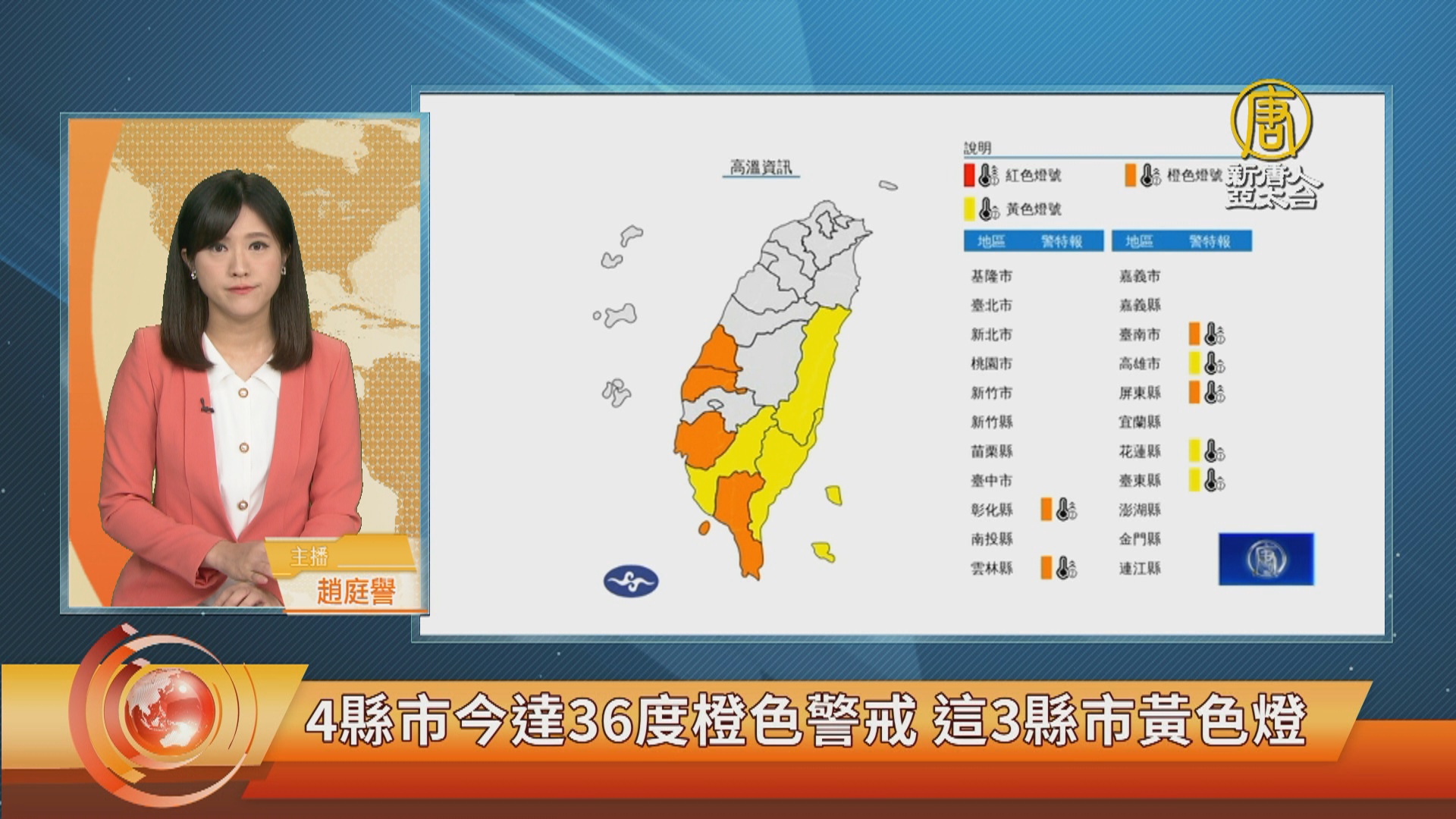 【新唐人亞太台 2024 年 06 月 20 日訊】時序進入夏季,氣象署今天發布高溫警戒,包括彰化縣、雲林縣、台南市及屏東縣地區,今天中午前後為橙色燈號,有連續出現36度高溫的機率,另外,高雄市、花蓮縣及台東縣地區則為黃色燈號,提醒觀眾朋友要留意,以免遭受熱傷害或中暑。