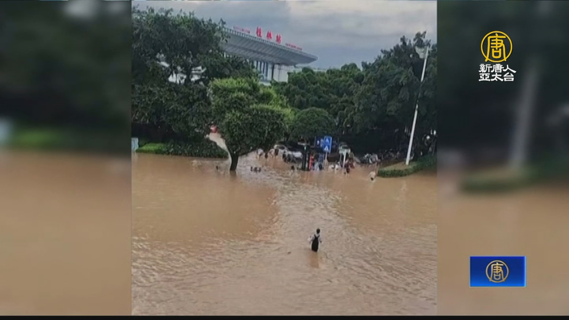 【新唐人亞太台 2024 年 06 月 20 日訊】受到持續強降雨影響,中國廣西桂林主要河道水位迅速暴漲,周三(19日)上升至148.55公尺,是桂林26年來最大洪水。主城區出現嚴重水患,多個景點關閉,部分學校宣布停課,公車多條線路停駛,桂林火車站被淹,暫時關閉。