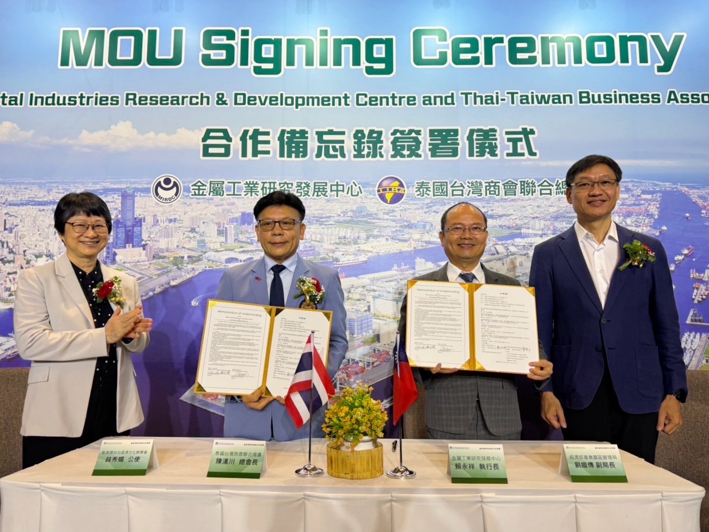 「財團法人金屬工業研究發展中心」與「泰國臺灣商會聯合總會」簽署合作備忘錄(MOU),促進臺泰雙邊產業交流。(經濟部產業園區管理局提供)