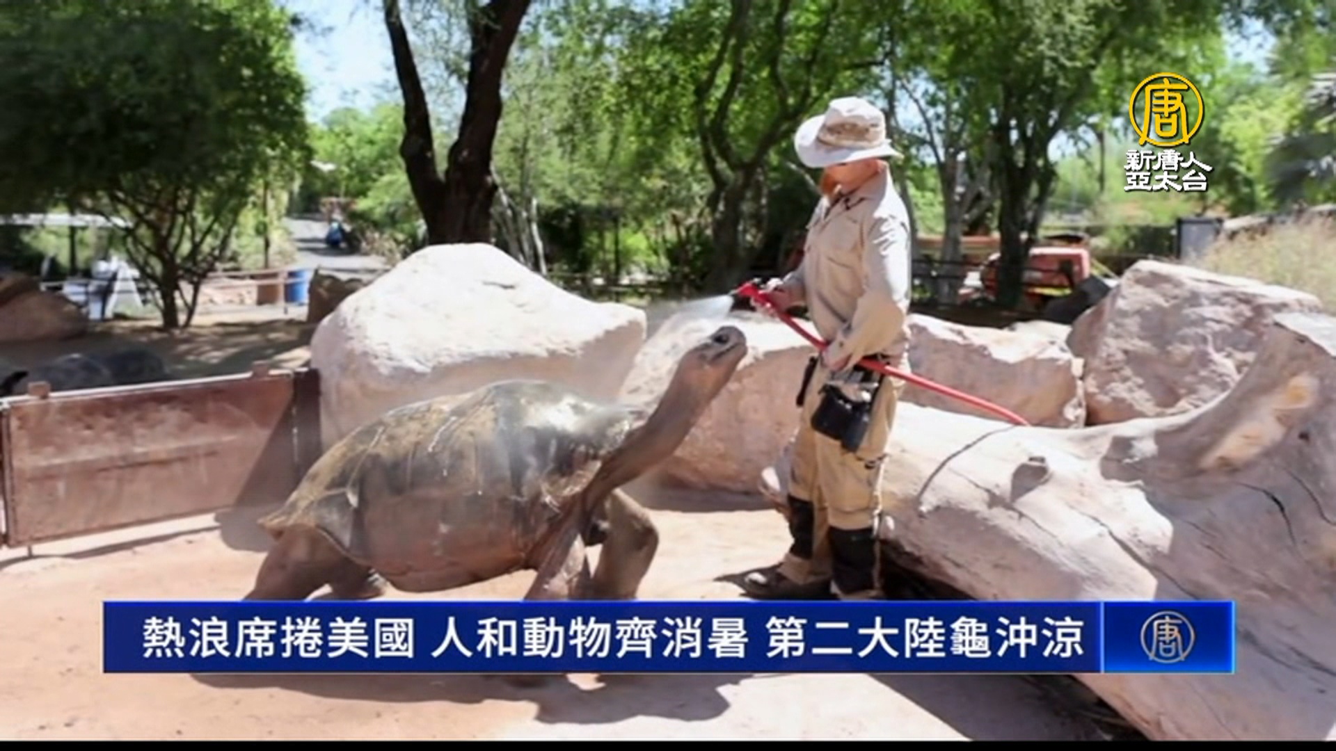 另一邊,在亞利桑那州,飼養員正在給眼前這隻、世界第二大的陸龜——亞達伯拉象龜噴水,幫助它降低體溫。