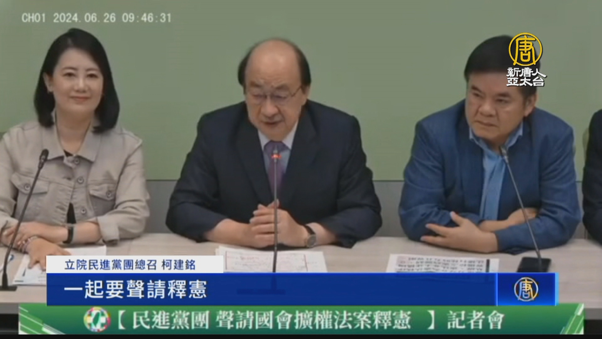 【新唐人亞太台 2024 年 06 月 26 日訊】國會職權修法法案今天生效,民進黨立法院黨團總召柯建銘等人,上午與律師在立院召開記者會說明提釋憲的七大理由後前往司法院,目前,有四個機關陸續提出釋憲及暫時處分,在野批評認為,賴總統如果在釋憲出爐前,不赴立院做國情報告,就是凌駕法律。