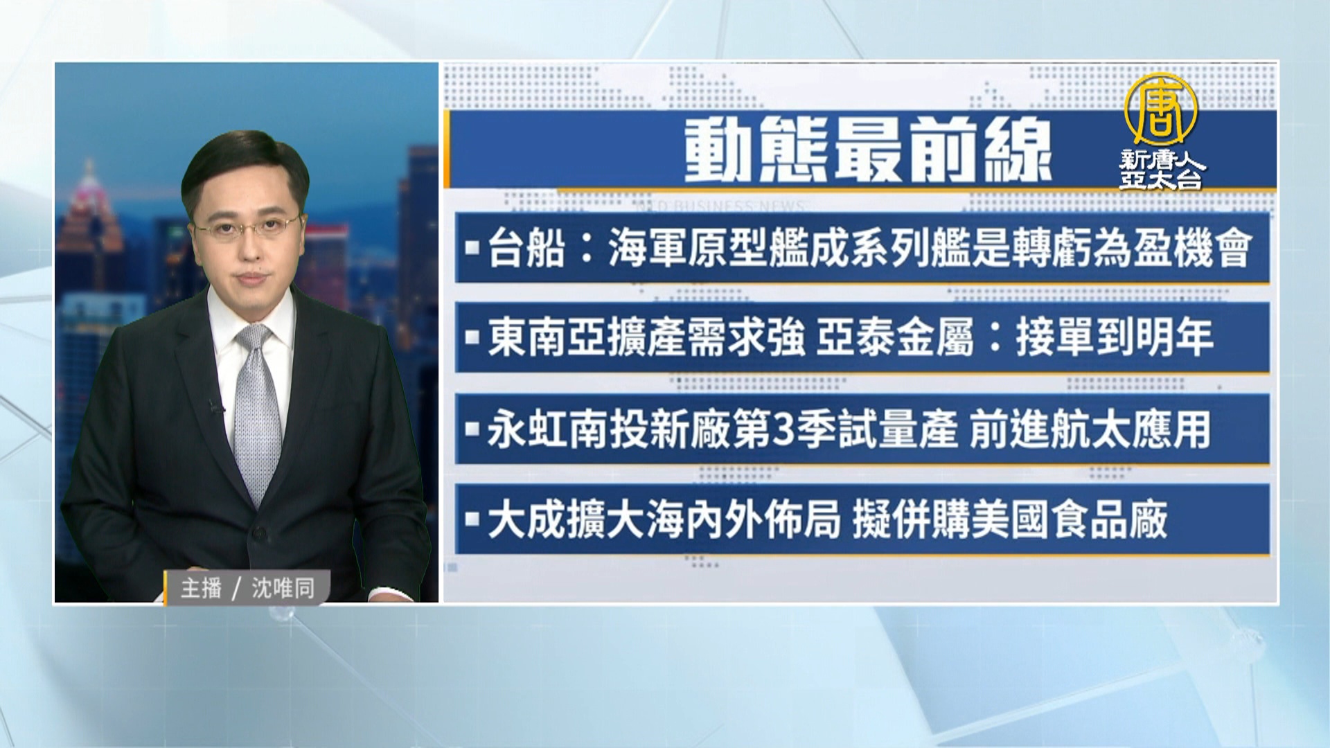 【新唐人亞太台 2024 年 06 月 26 日訊】帶您看到今天的產業動態。台船今天召開股東會,董事長鄭文隆表示,所造潛艦都是原型艦,海軍計畫將原型艦發展成系列艦,這會是台船的機會;銅箔基板(CCL)高階含浸設備廠亞泰金屬,總經理表示,受惠 CCL、PCB 相關大廠陸續增加資本支出投入,並前往東南亞擴廠布局,助攻亞泰金屬大量承接訂單,目前訂單能見度已看到2025下半年;永虹先進布局航太應用,旗下南投新廠,為全台首座航太熱塑性碳纖維複合材料生產工廠,最近正在進行客戶認證,預計第3季開始試量產;大成董事長韓家宇透露,今年海外布局將在美國擴大投資,嘉義馬稠後食品加工廠也已開始獲利,寵物食品廠則預計Q4開始動工
