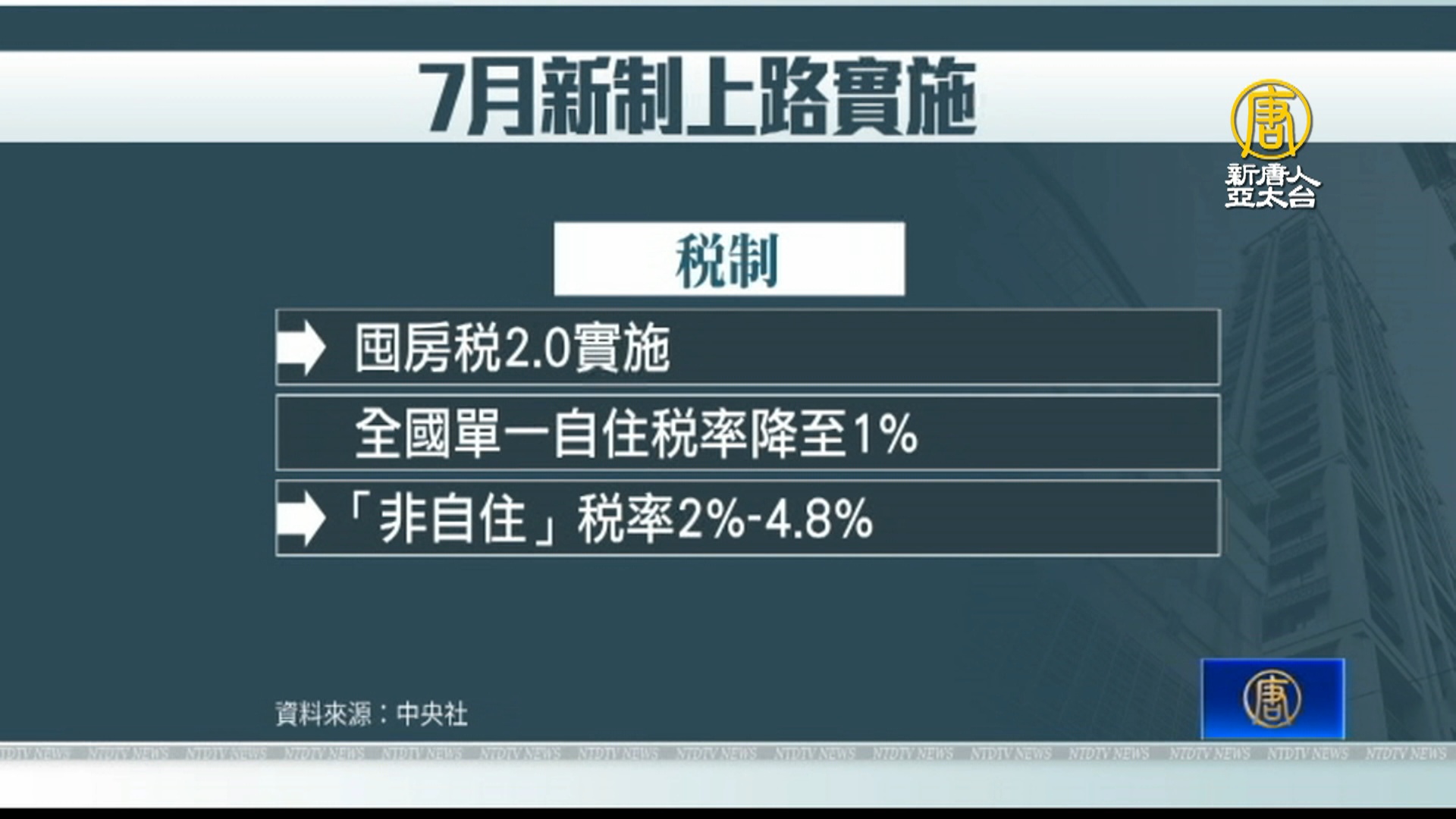 稅制方面,囤房稅2.0新制實施,單一自住房屋稅率由1.2%調降為1%;「非自住」採全國歸戶,稅率調升為2%至4.8%。