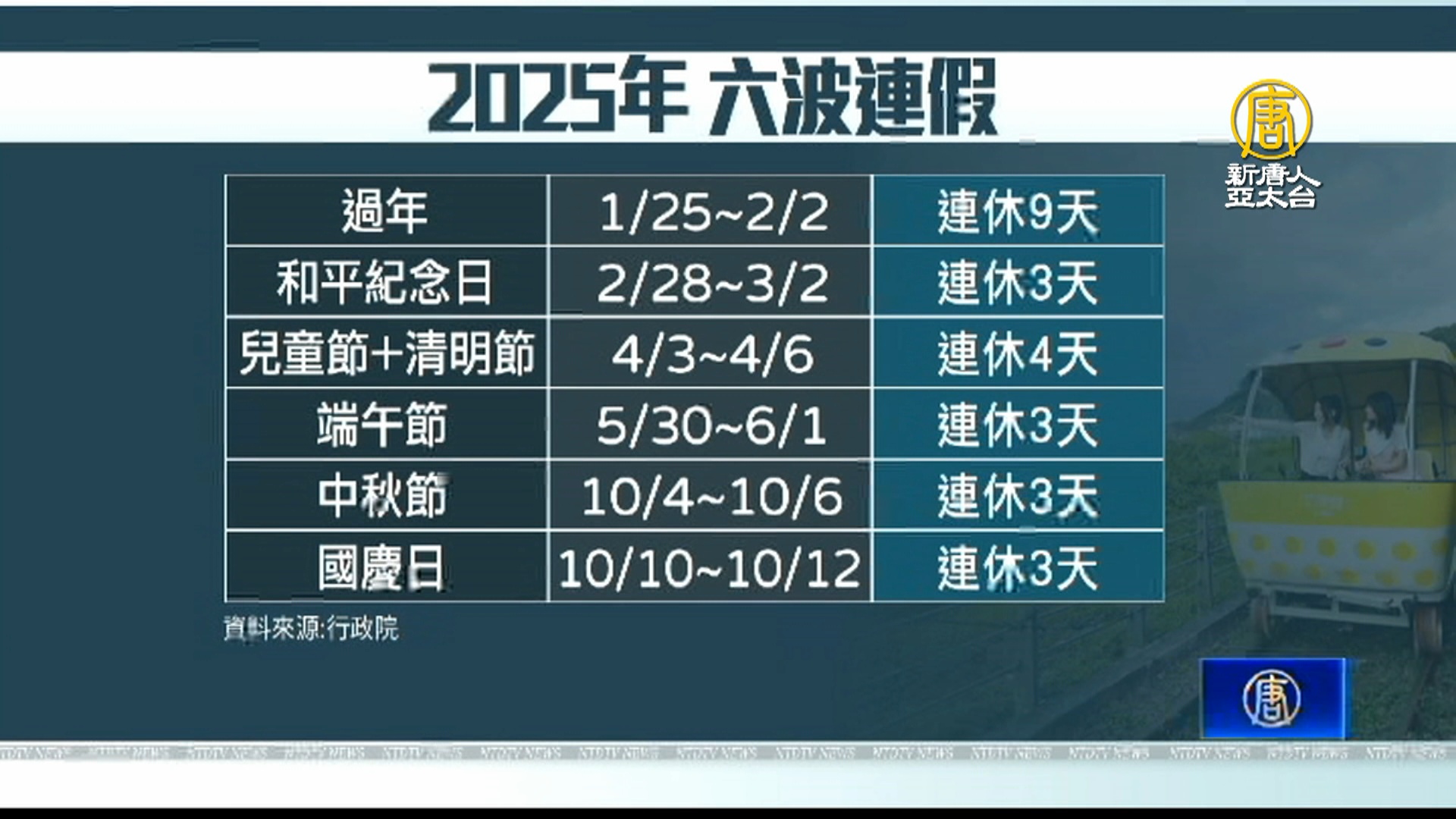 【新唐人亞太台 2024 年 06 月 28 日訊】行政院昨天核定2025年政府行政機關辦公日曆,總放假日天數115天,其中三天以上的連假一共有六個,包括過年連休9天,其他連假包括和平紀念日、清明節、端午節、中秋節以及國慶日。