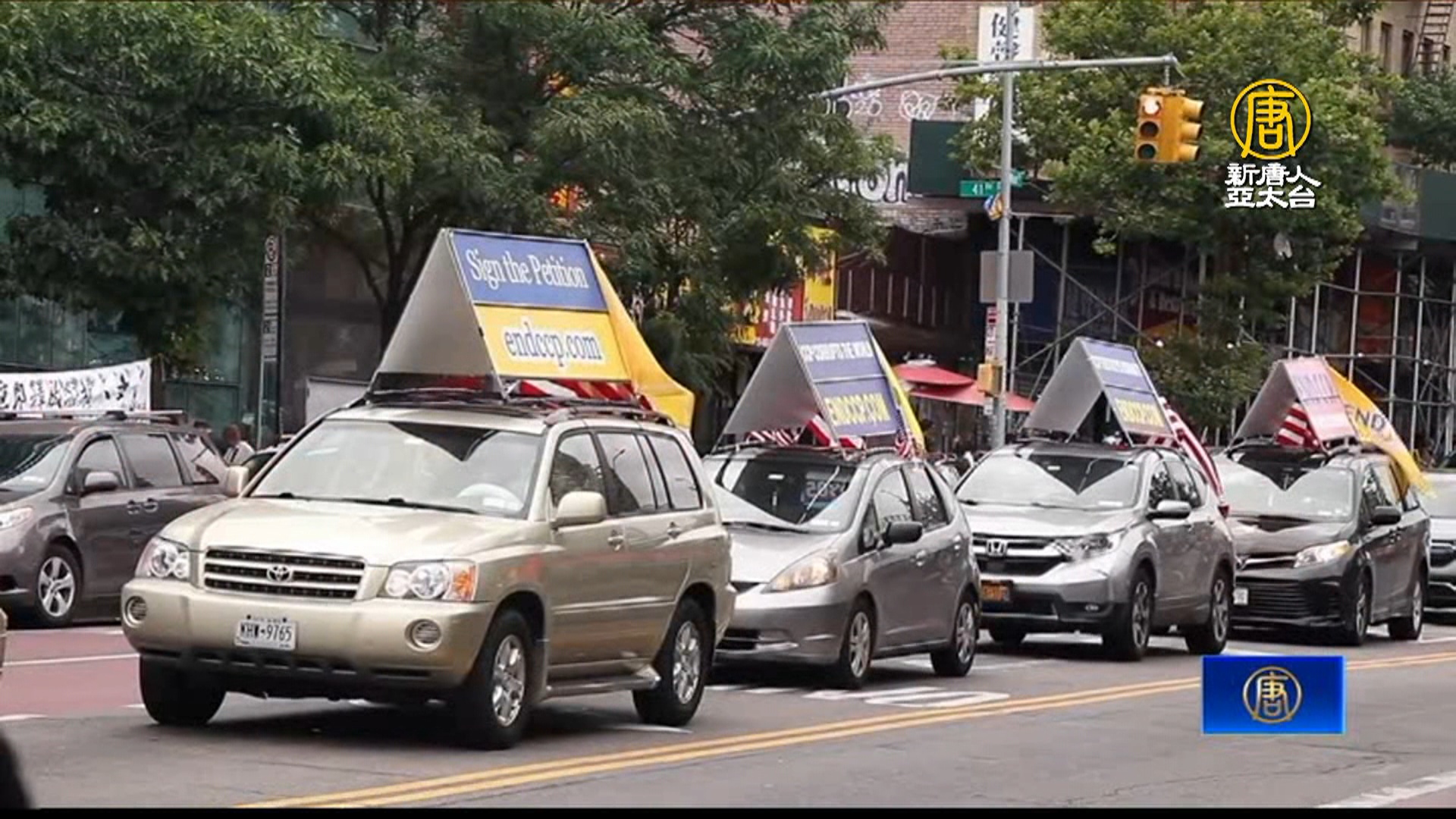 記者:「一輛輛車插上美國國旗、載著醒目的標語『中共不等於中國』、『打倒中共惡魔』等,形成了流動的真相點,那麼車隊將會途經紐約市的三大華人社區。」