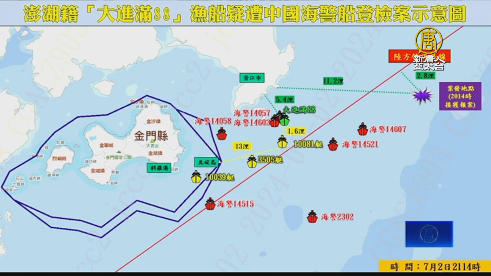 2024-07-03 10:05:37早安新唐人先帶您關心,台灣澎湖籍「大進滿88號」漁船,昨天晚間在金門復國墩海域捕捉小管時,突然遭到2艘中共海警船靠近拍照後強行登檢,並掌控船上通訊聯絡等,企圖將船隻帶往中國,台灣海巡署獲報後,派兩艇急速馳援,採攔截航線深入船隊中,後來又派一艇前往協處,三艇與中共海警對峙,廣播要求釋放台灣籍漁船,海巡署偵測到周邊尚有4艘中共海警船集結,海巡寡不敵眾,最後,船隻遭中共帶往福建圍頭港。「大進滿88號」船上5人身分包括,包括洪姓船長、1名台籍船員及3名印尼移工。今天上午10點,海巡署將召開記者會對外說明。