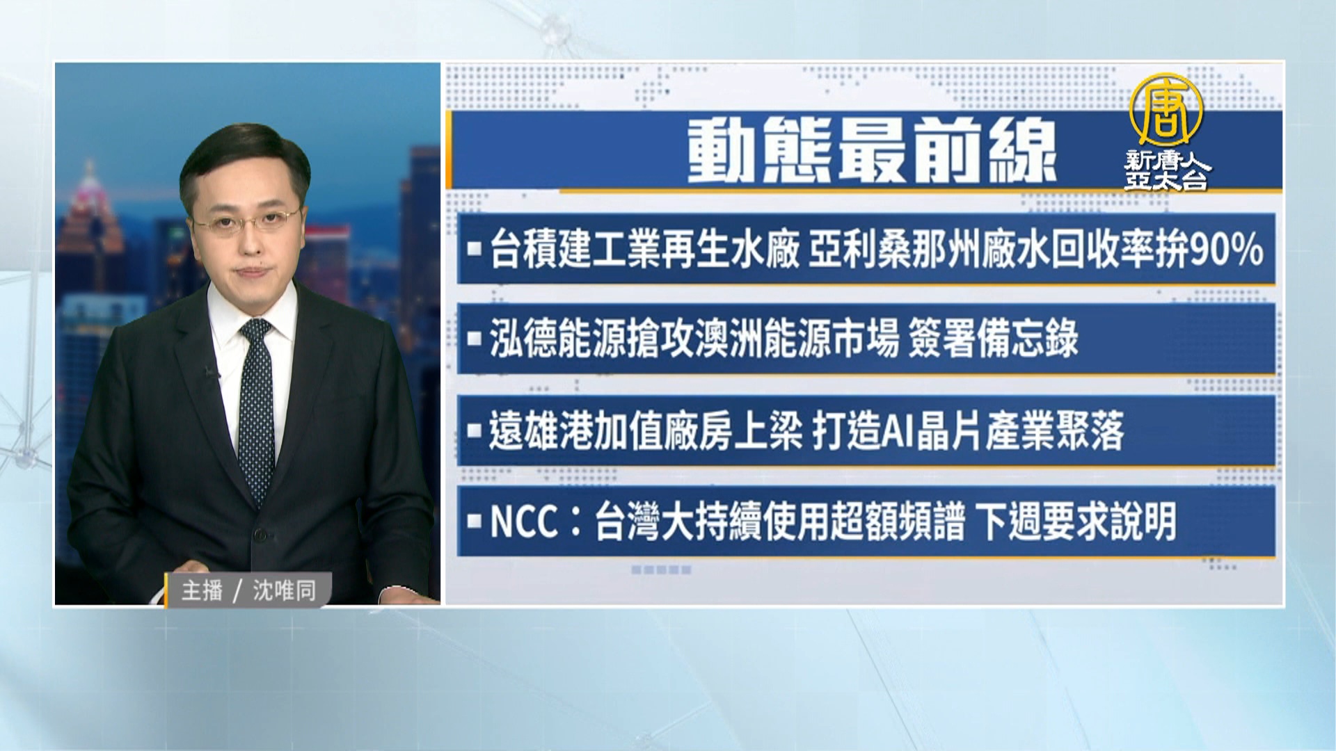 【新唐人亞太台 2024 年 07 月 03 日訊】帶您看到今天的產業動態。台積電美國亞利桑那州第1座晶圓廠將於明年初啟用,為達成90%的水回收率目標,台積電規劃廠區內興建一座工業用再生水廠,預計2027年完成;泓德能源與澳洲電力零售商 ZEN Energy簽訂備忘錄,未來也將攜手共同合作綠氫等綠色能源事業;遠雄航空自由貿易港區啟用第2階段的加值園區,今天擴充加值的廠房H棟舉辦上梁典禮,預計年底完成興建工程;NCC今天表示,透過量測電波、行政調查等方式發現,台灣大仍持續使用1GHz以下的超額頻譜,已違反合併案附款內容及網路設置計畫,下週要求台灣大到會說明,再討論開罰。