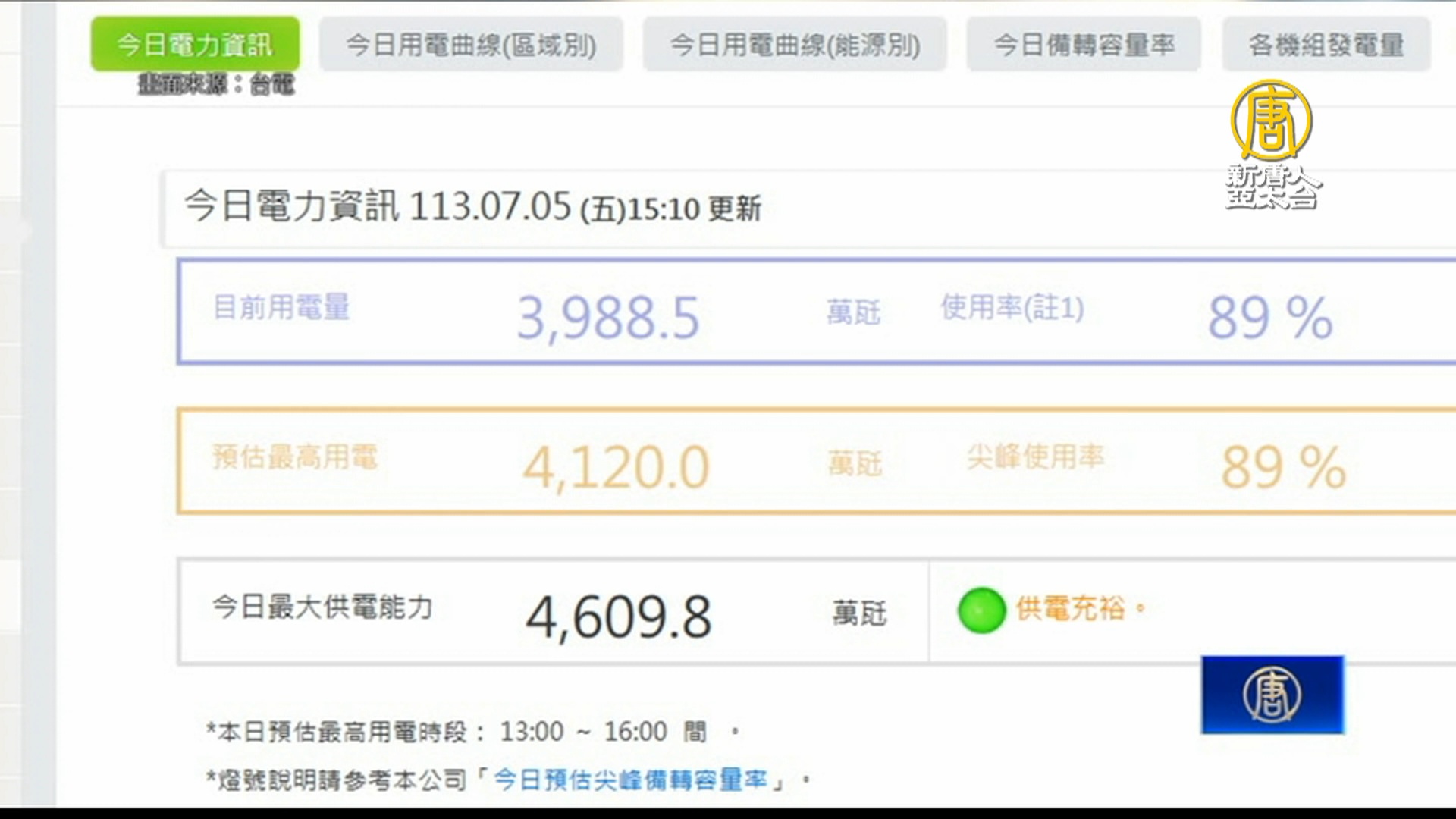 【新唐人亞太台 2024 年 07 月 05 日訊】這幾天高溫炎熱,民眾增加使用空調跟冷氣,進一步推升整體用電量。氣象署指出,今明兩天將是最酷熱的時候,根據台電資訊顯示,今天下午兩點半的用電量來到4052萬瓩,備轉容量率為11.89%;台電預估今日最高用電量為4120萬瓩。