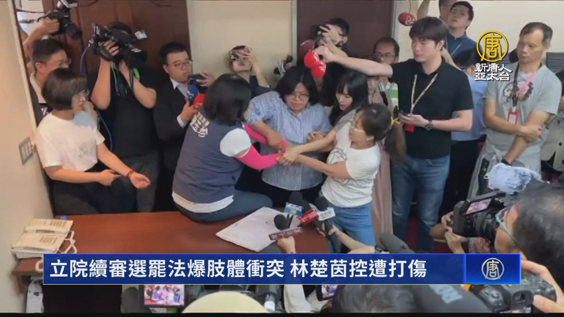 【新唐人亞太台 2024 年 07 月 08 日訊】立法院內政委員會今天(8日)再度排審選罷法修正草案,民進黨立法院黨團上午6點多發動甲級動員,阻擋法案遭強行初審通過,民進黨與國民黨立委為了搶占主席台,爆發肢體衝突,民進黨立委林楚茵指控國民黨立委王鴻薇打傷。