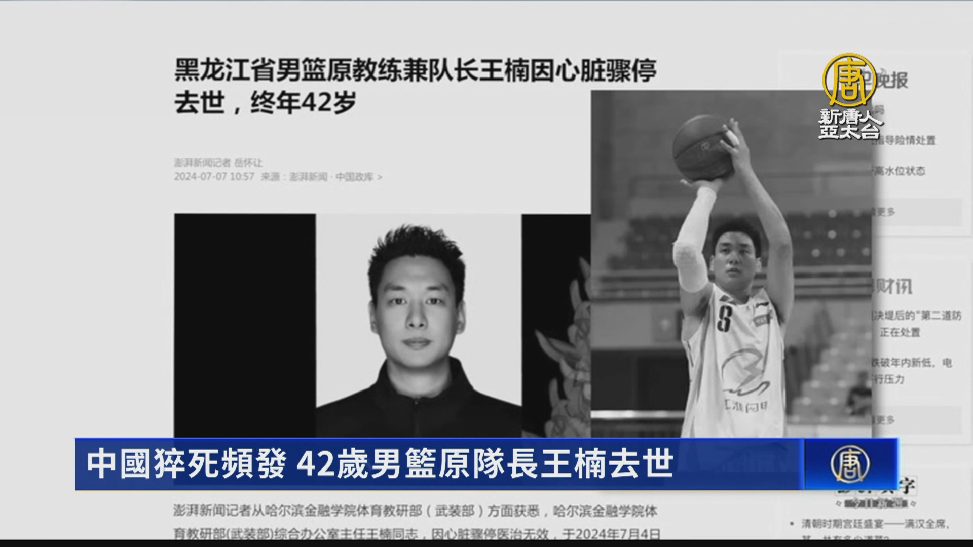 【新唐人亞太台 2024 年 07 月 08 日訊】中國運動員再傳猝死消息。繼17歲的中國羽球員張志傑猝死後,42歲的黑龍江原男子籃球隊教練兼隊長王楠,也在7月4日去世,官方稱原因是心臟驟停。多地民眾也披露,身邊猝死現象比以往多,疫情過後或接種疫苗後,普遍心臟出問題。