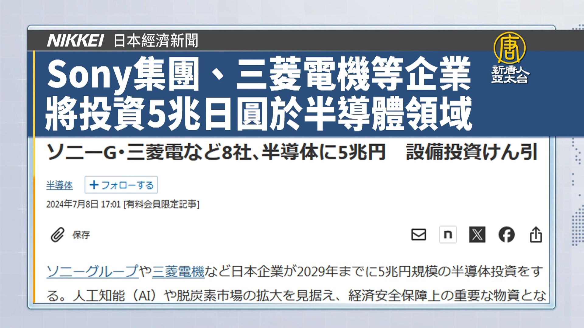 來看到日本經濟新聞報導:Sony集團、三菱電機等日本8家企業,將在2029年以前投資5兆日圓在半導體領域。