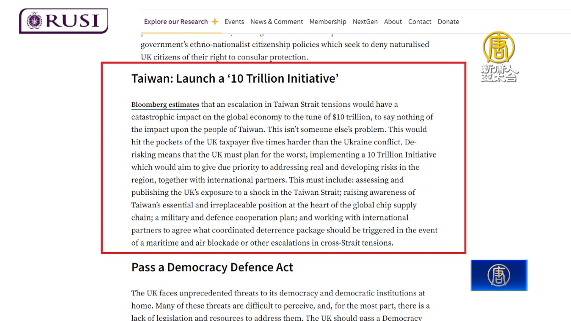 【新唐人亞太台 2024 年 07 月 12 日訊】台海安全受到國際高度重視,英國國會大選落幕後,工黨接替保守黨執政,兩黨人士近日提出聯名撰文,要求政府提出對中戰略,其中包括一份「10兆美元保台倡議」,保守黨前資深國會議員希里、以及工黨國際發展倡議執委帕泰克,他們在英國智庫刊文指出,台海戰爭恐造成全球約10兆美元損失,台海衝突對英國納稅人造成的財務衝擊,恐怕是烏克蘭戰爭5倍之多,認為政府有必要發起「10兆倡議」,包括,評估並公布台海危機對英國的衝擊;提升公眾對台灣在全球晶片供應鏈不不可取代地位的認識;軍事防衛合作計畫;以及與國際夥伴議定,在台海出現海、空封鎖時,該採取什麼樣的嚇阻方案。