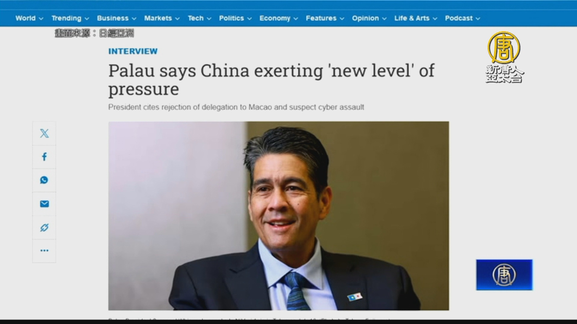 【新唐人亞太台 2024 年 07 月 17 日訊】日本舉辦太平洋島國峰會,日媒報導,帛琉總統惠恕仁受訪表示,中共的施壓達到「新層次」,例如帛琉旅遊代表團日前入境澳門被拒絕;帛琉也在調查本月海關與邊境保護系統遭遇網攻事件,疑似與中共有關。報導指出,帛琉是少數與台灣保持外交關係的國家之一,也是3個與美國簽訂自由聯合協定的國家之一,美國根據協定提供安全保障和經濟援助,換取軍事准入。