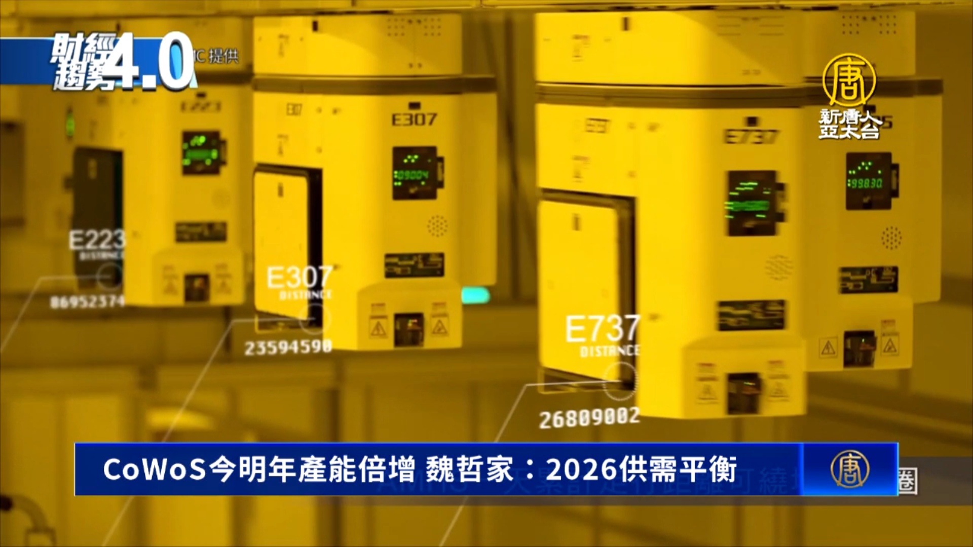 【新唐人亞太台 2024 年 07 月 20 日訊】好,台積電法說會上,一大焦點就是,先進封裝CoWoS需求,台積電董事長魏哲家,用了好幾次「緊俏」,來形容訂單情況,他預估,今、明兩年,CoWoS產能都會超過翻倍,一直到2026年,才會供需平衡。