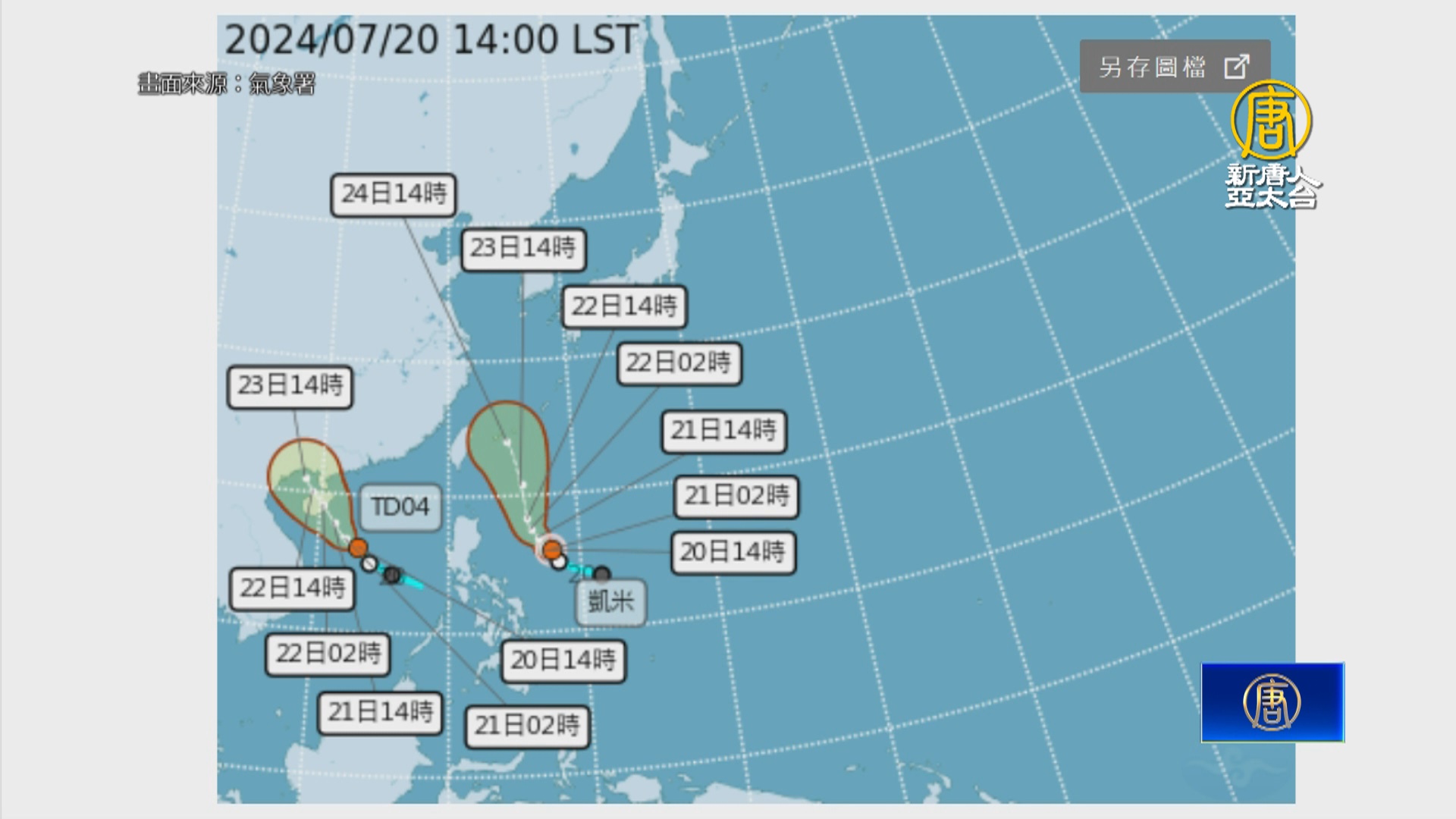 【新唐人亞太台 2024 年 07 月 22 日訊】早安新唐人先來關心,凱米颱風來襲,氣象署最快今天深夜發海上颱風警報,預計星期三、星期四最接近台灣,強度將達中度以上;另外,今年第4號颱風巴比侖生成,氣象署說巴比侖不會直接影響台灣,巴比侖與凱米相距1500公里,也不會發生雙颱效應。