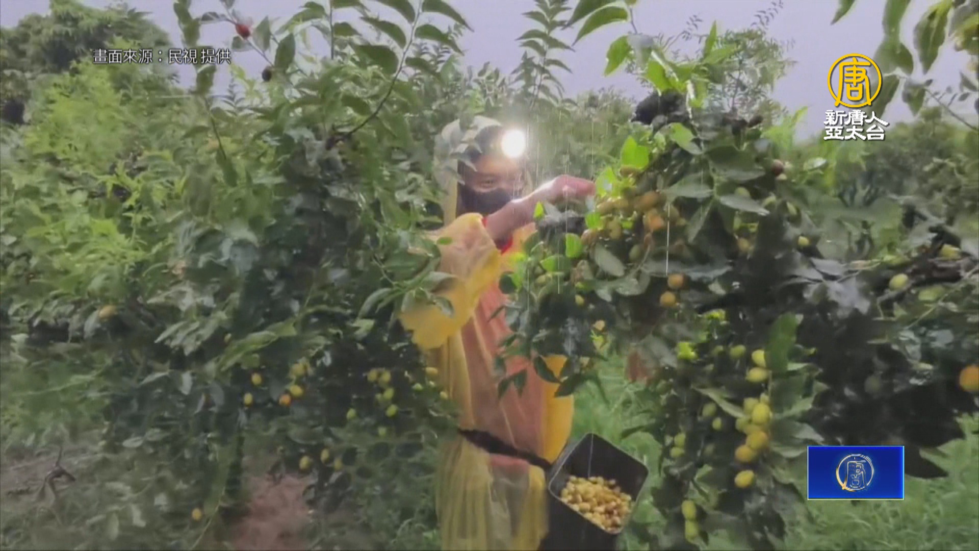 天還沒亮,農民前進紅棗園搶收紅棗。颱風腳步進逼,農民穿著雨衣冒雨採收,也雇用好幾位工人一起採收,估計最多可以採收2000斤的紅棗,因為正值紅棗盛產季,能採多少算多少,擔心被颱風掃過,損失嚴重。