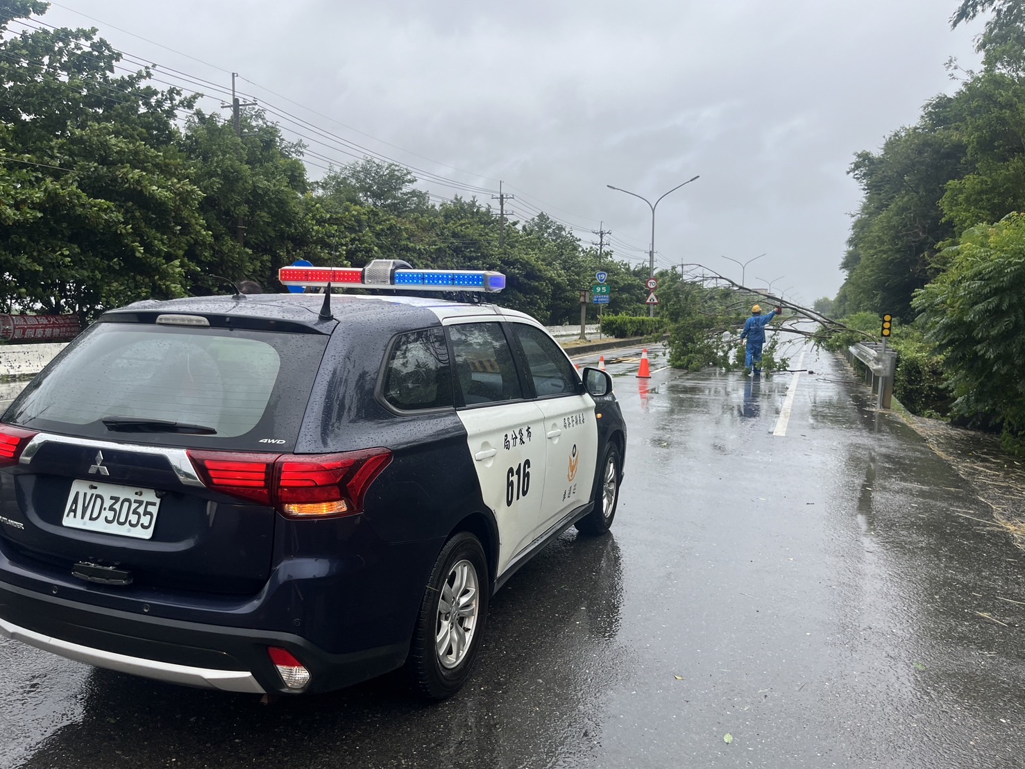 嘉義縣警察局布袋分局指出, 凱米颱風帶來驚人雨勢,造成樹倒、溪水暴漲,有民眾通報義竹鄉台19線95公里處(北往南)路樹被吹斷折腰,佔據車道,義竹分駐所獲報後,警員蔡欣哲、林文蕉立即前往處理。到達現場,發現用路人為閃避路障險象環生,且樹幹龐大,無法以人力即時排除,當下通報義竹鄉公所災害應變中心派員至現場協助處理;員警也在場警戒並擺設交通錐示警,同時冒雨中疏導該路段車輛,以利通行;隨後公所派員攜機具到場排除,目前道路已恢復通行。