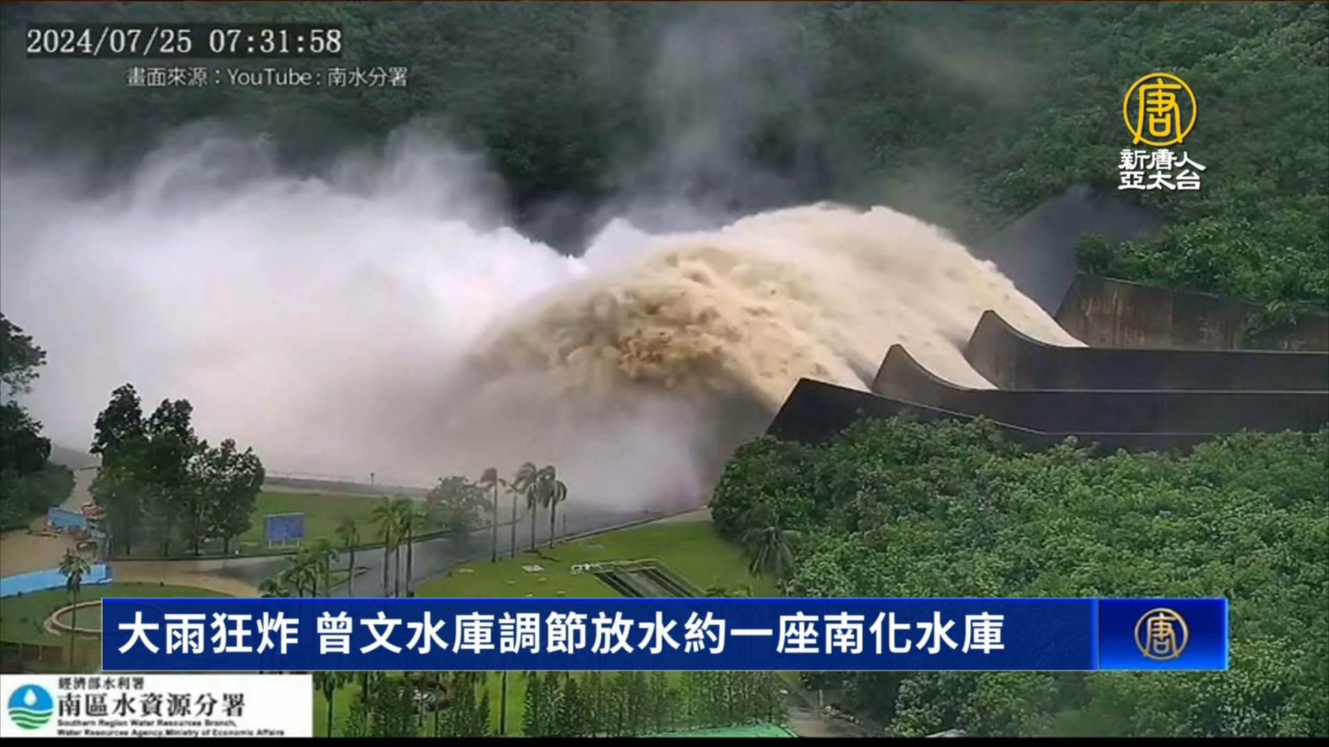 【新唐人亞太台 2024 年 07 月 25 日訊】凱米颱風挾帶豐沛雨水,各大水庫都有進帳,根據水利署統計,兩天降雨至少替全台水庫帶來9.7億噸水量,颱風大雨持續狂炸,南部曾文水庫,從昨天開始啟動調節性放水,今天凌晨更加大放水量,溢洪道3道水門全開,截至今上午9點已調節放水8776.4萬立方公尺,接近1座南化水庫的蓄水量。