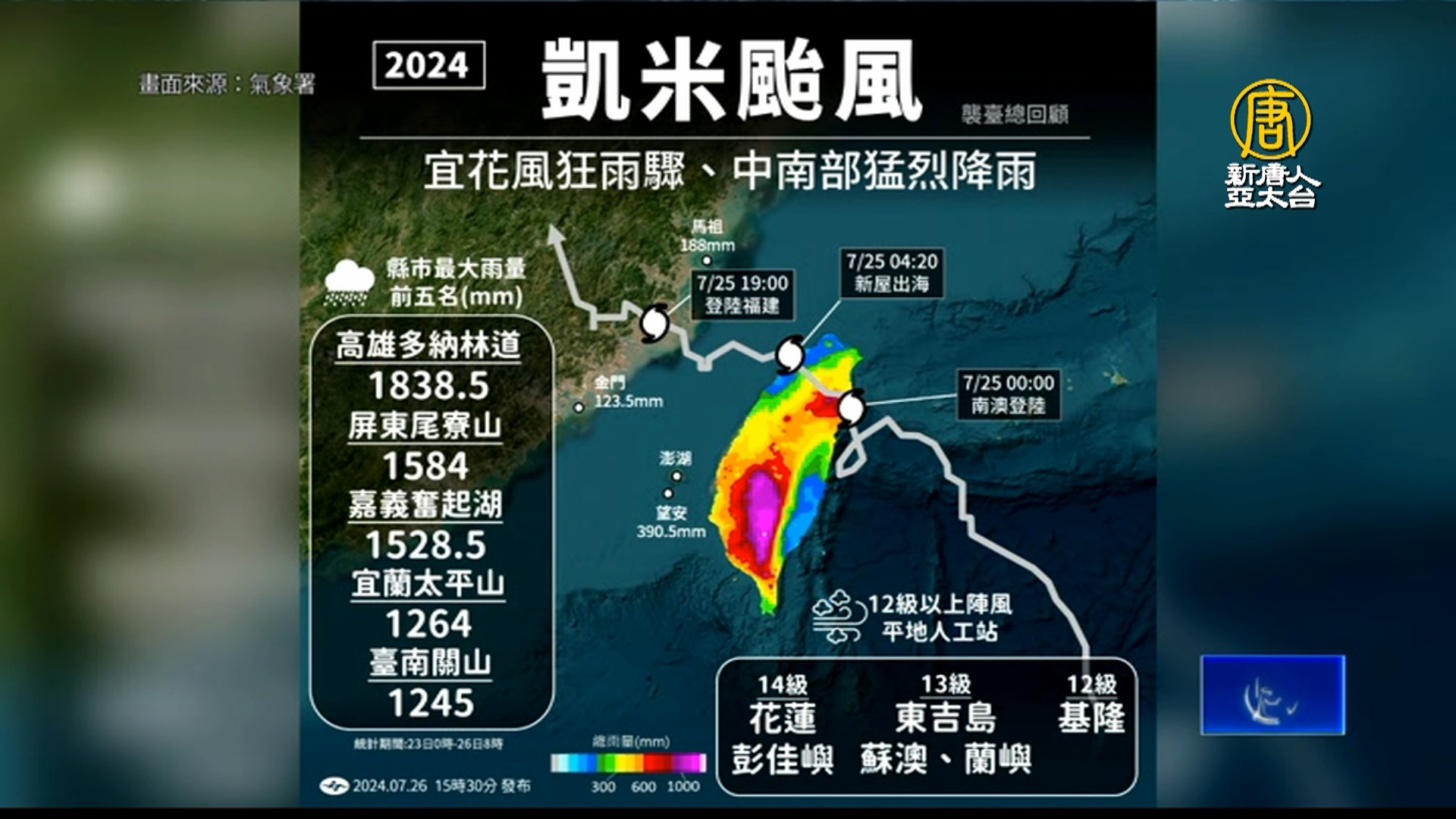 【新唐人亞太台 2024 年 07 月 26 日訊】台灣氣象署今天(26日)上午解除凱米颱風的海上陸上警報,不過外圍環流偏南風仍持續帶來水氣。下午,氣象署針對中南部5縣市發布大雷雨訊息,嘉義機場地面作業一度暫停,台南安南地區因這場午後大雨又再度淹水。凱米颱風帶來的破紀錄豪雨,也重創南投縣山區,信義鄉多處土石流、坍方,上千居民交通受阻,傍晚信義鄉確定明天(27日)再停班、停課一天。凱米颱風,創下氣象署統計的,降雨「3個歷史第一」,包括第1次預報南部累計降雨1800毫米、兩天發布20次致災性細胞廣播、以及高雄市平地降雨量歷史新高。