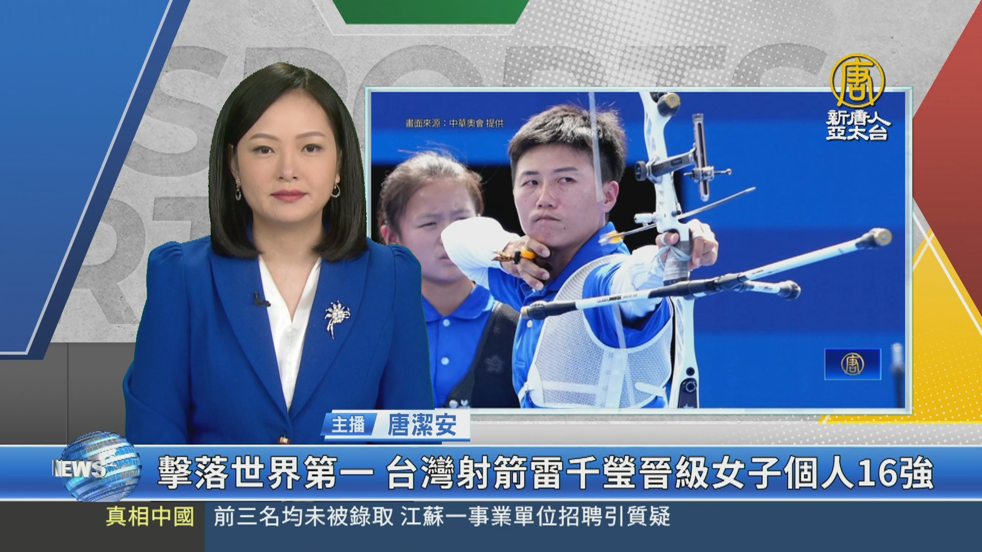 【新唐人亞太台 2024 年 08 月 01 日訊】歡迎回來,台灣射箭再傳好消息。34歲射箭老將「雷母」雷千瑩,就在剛剛,以積分7比3,擊敗世界排名第一的美國選手考夫霍爾德,成功晉級女子個人16強,打出個人賽最好成績,最後一回合更連續射出三支10分。2016年,雷千瑩曾在里約奧運,為台灣獲得女子射箭團體銅牌。