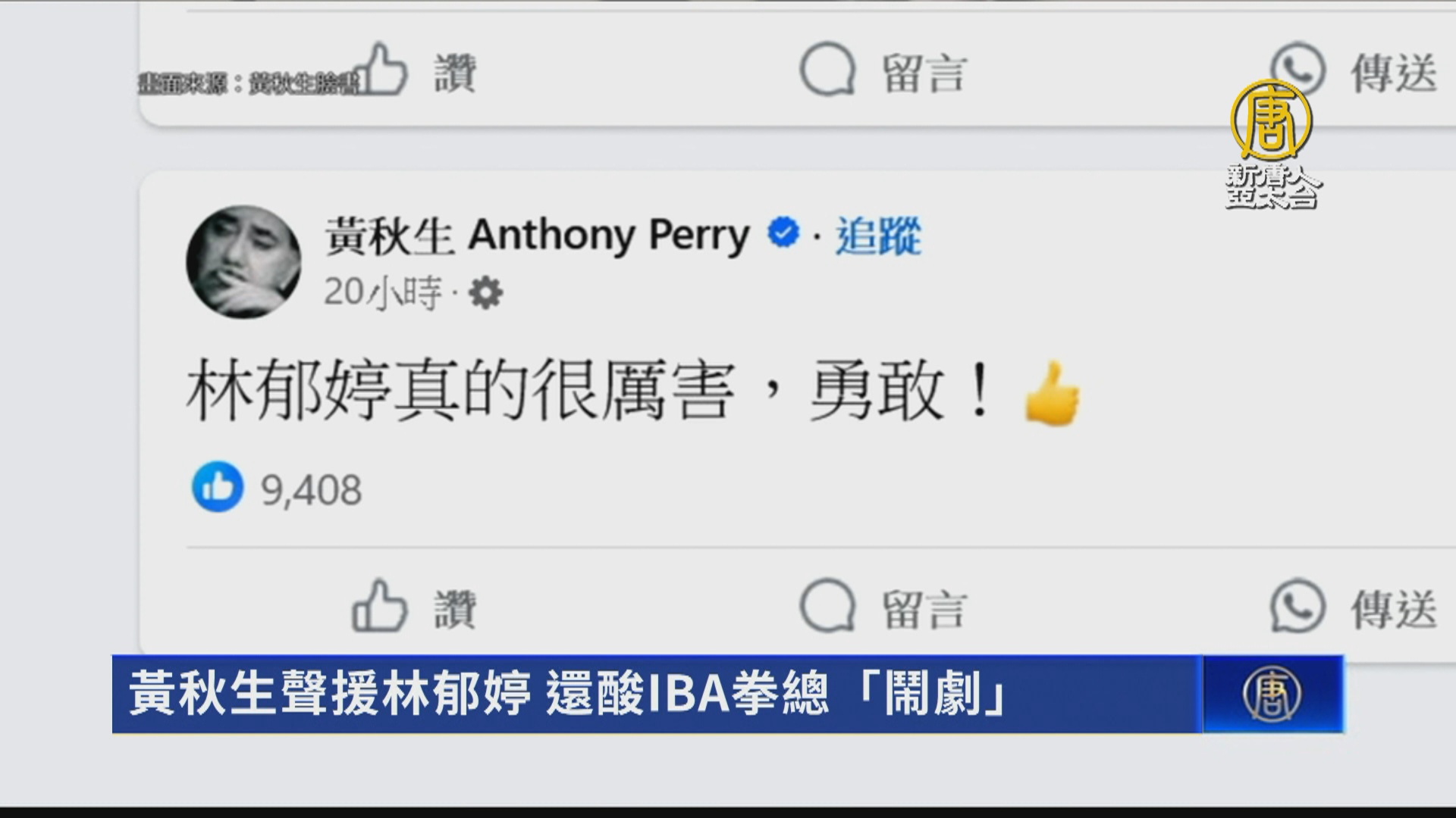 【新唐人亞太台 2024 年 08 月 06 日訊】國際拳擊總會砲轟國際奧會「摧毀女子體育」,再度宣稱台灣女拳王林郁婷、阿爾及利亞女拳手克莉芙不符參賽性別資格。台灣不少公眾人物都紛紛為林郁婷抱不平,連來自香港的金馬影帝黃秋生也在臉書發文聲援,誇讚「林郁婷真的很厲害,勇敢!」許多粉絲謝謝他的力挺,黃秋生回應表示:他不是發聲,他是敬佩!今天上午,黃秋生再發文開酸「IBA(國際拳擊總會)記者會所謂的公開證據,原來是場鬧劇。
