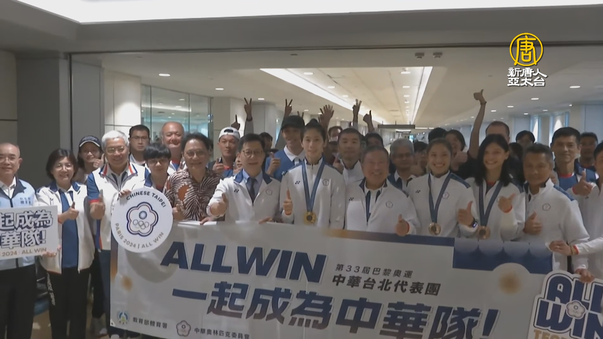 【新唐人亞太台 2024 年 08 月 13 日訊】早安新唐人先來看到,巴黎奧運落幕,台灣代表隊這次拿下2金5銅,創隊史第二佳,包括,金牌拳后林郁婷、摘下銅牌的拳擊好手陳念琴、吳詩儀等多位國手們,今早7點10分返抵國門,總統賴清德指示空軍派遣三架F-16V戰機伴飛,這次也以航空界最高規格「水門禮」致敬,您看到許多粉絲已經守在機場等候,而在飛機起飛前,機長以中英文廣播致意,感謝選手們努力為台灣拿下優秀的成績,壓軸提到林郁婷時,更以「台灣的女兒,世界的拳后」來形容,機艙裡響起熱烈掌聲,