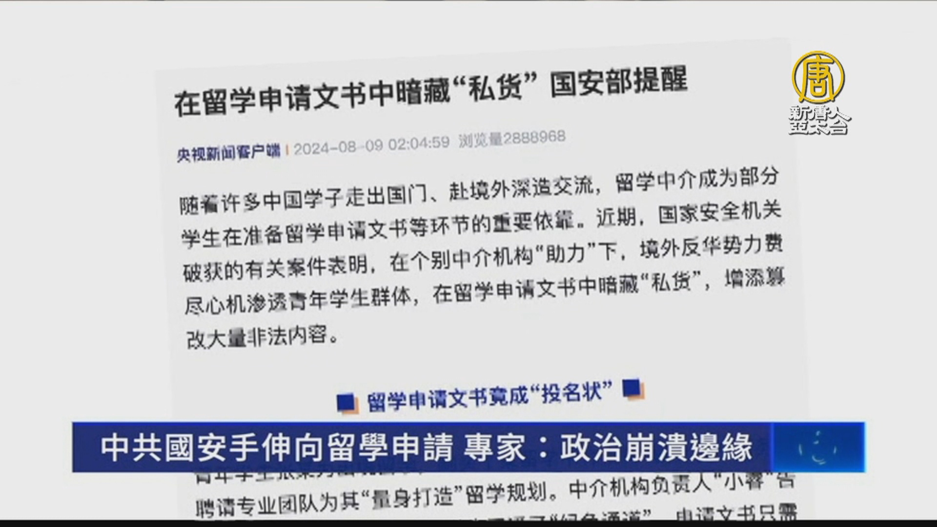 【新唐人亞太台 2024 年 08 月 13 日訊】中共對外升高軍事威脅的同時,對內也收緊管控,中共國安部近日宣稱,部分留學中介「篡改學生履歷」,出現了所謂的「辱華」言論,專家指出,中共政治危機已經到了崩潰的邊緣,當局草木皆兵。