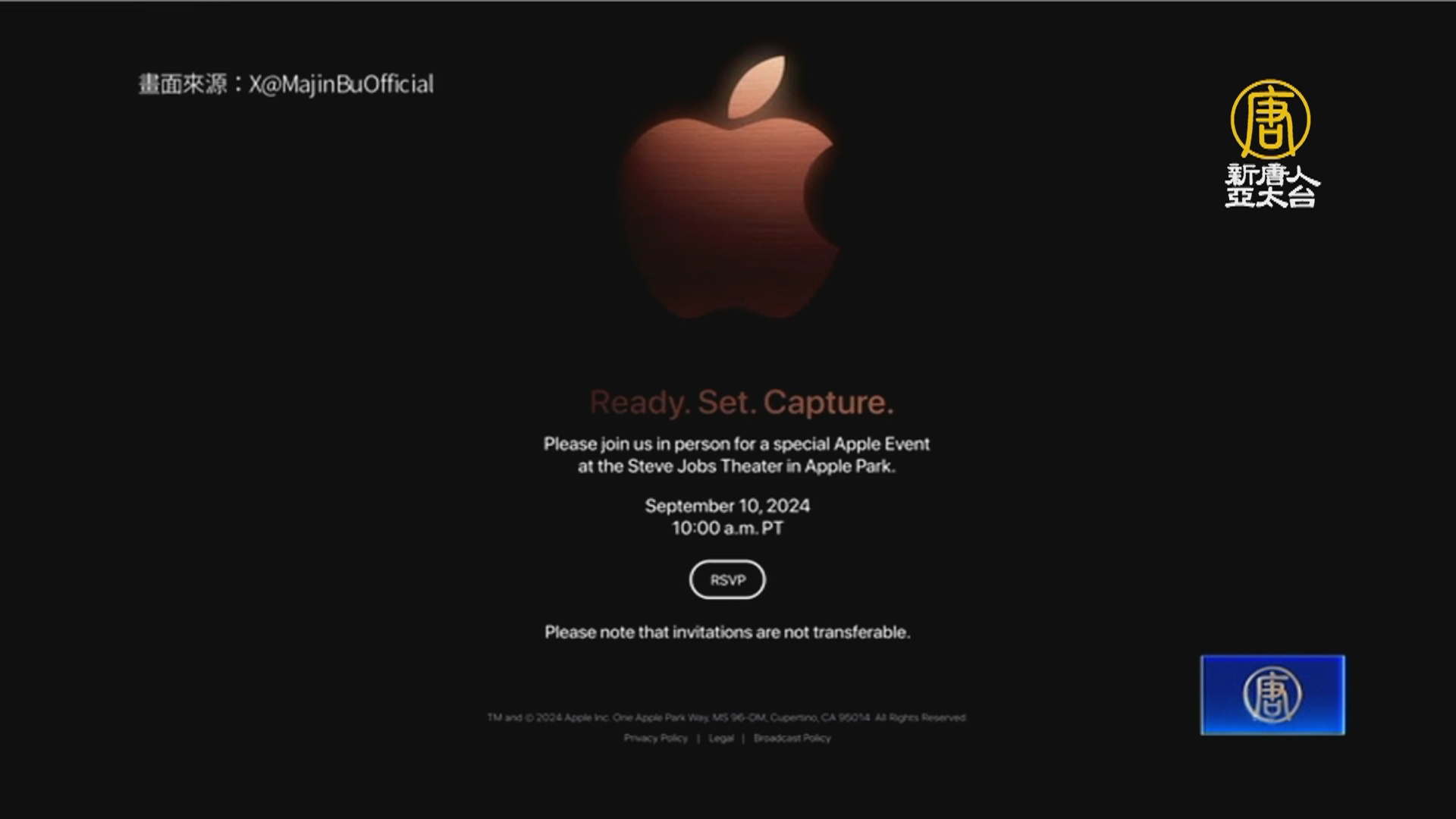 【新唐人亞太台 2024 年 08 月 20 日訊】蘋果公司新品發表會即將到來,發表會邀請函,疑似在社群平台提前曝光,邀請函內容寫到,蘋果將在9月10日舉行發表會。而先前有消息指出,iPhone 16加入神祕新色 沙漠鈦金屬,似乎就是邀請函主視覺色調,目前蘋果還未發出正式的邀請函。