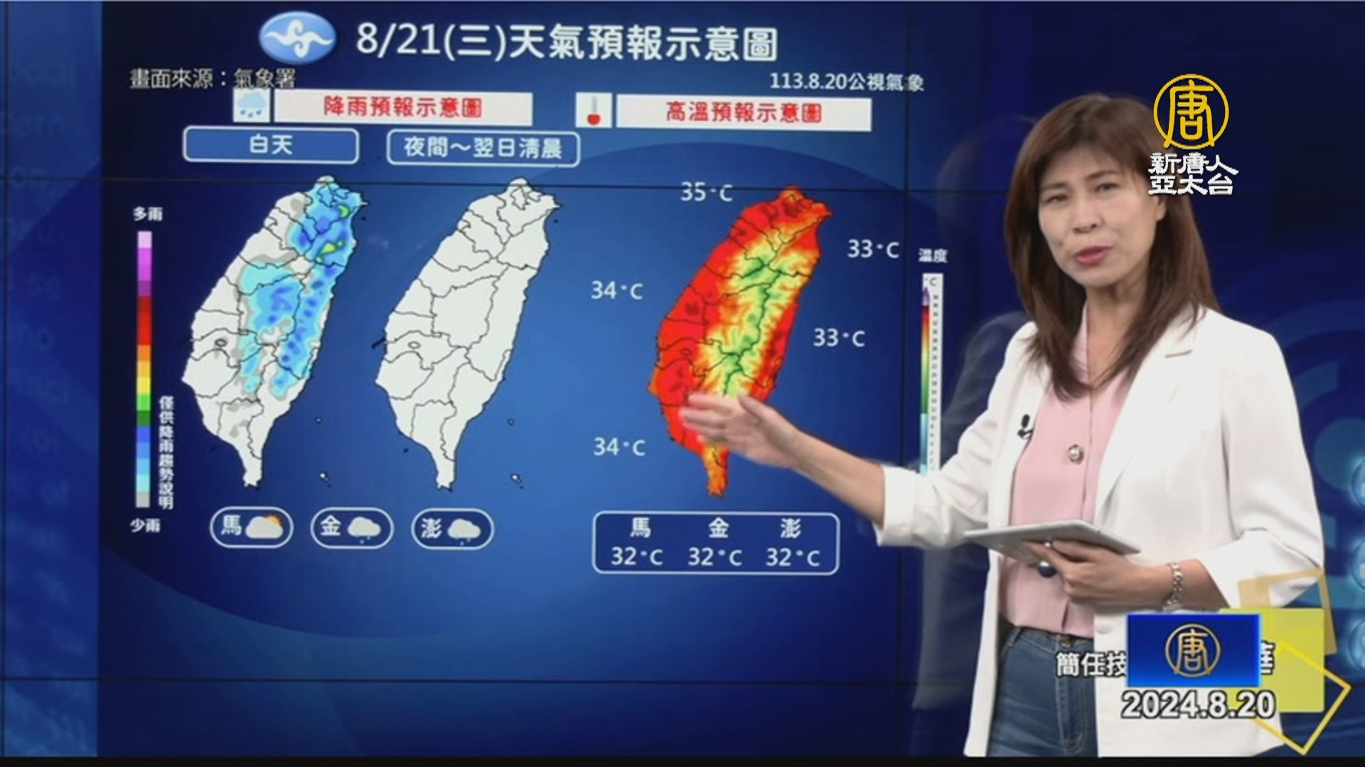 【新唐人亞太台 2024 年 08 月 20 日訊】帶您來關心天氣,受到西南風影響,對流雲系發展旺盛,氣象署對全台11縣市發布豪雨特報,雨勢可能持續到晚間,不過,氣象署表示,受到太平洋高壓增強明天起天氣緩和,中部以北雖仍有午後雷陣雨,不過晚間就會雨停,各地溫度也會隨之上升。