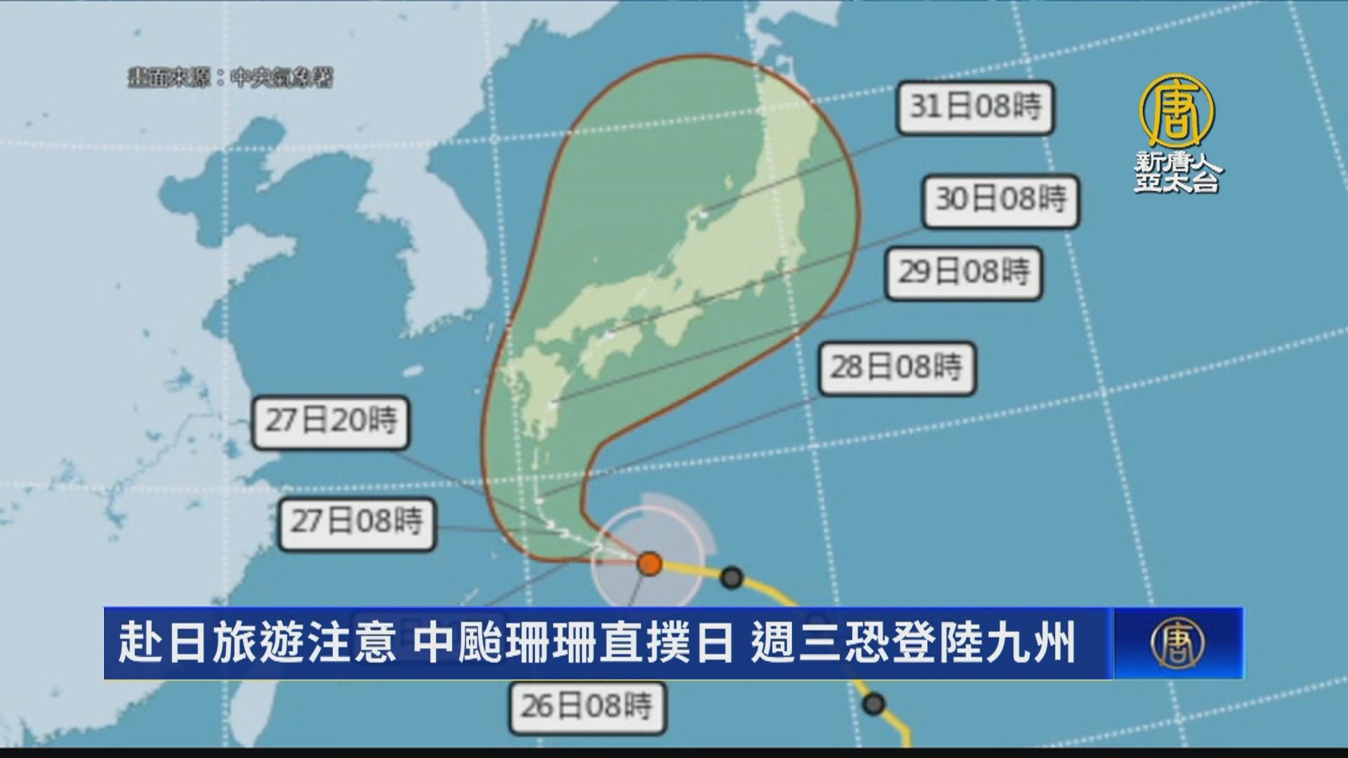 【新唐人亞太台 2024 年 08 月 26 日訊】新聞開始先來看到,今年第10號颱風「珊珊」,目前強度是中度颱風,預估明天將達到強度巔峰。現在珊珊颱風的位置在日本東南方的海面上,預計本週三、四將侵襲日本九州及本州。前中央氣象局長鄭明典在臉書貼文表示,從珊珊颱風的雲圖現況顯示,珊珊本身往北的分量會減弱,在海面停留的時間會拉長。登陸地點及時間仍不斷調整,提醒要前往日本的觀眾朋友,要密切注意颱風動態。