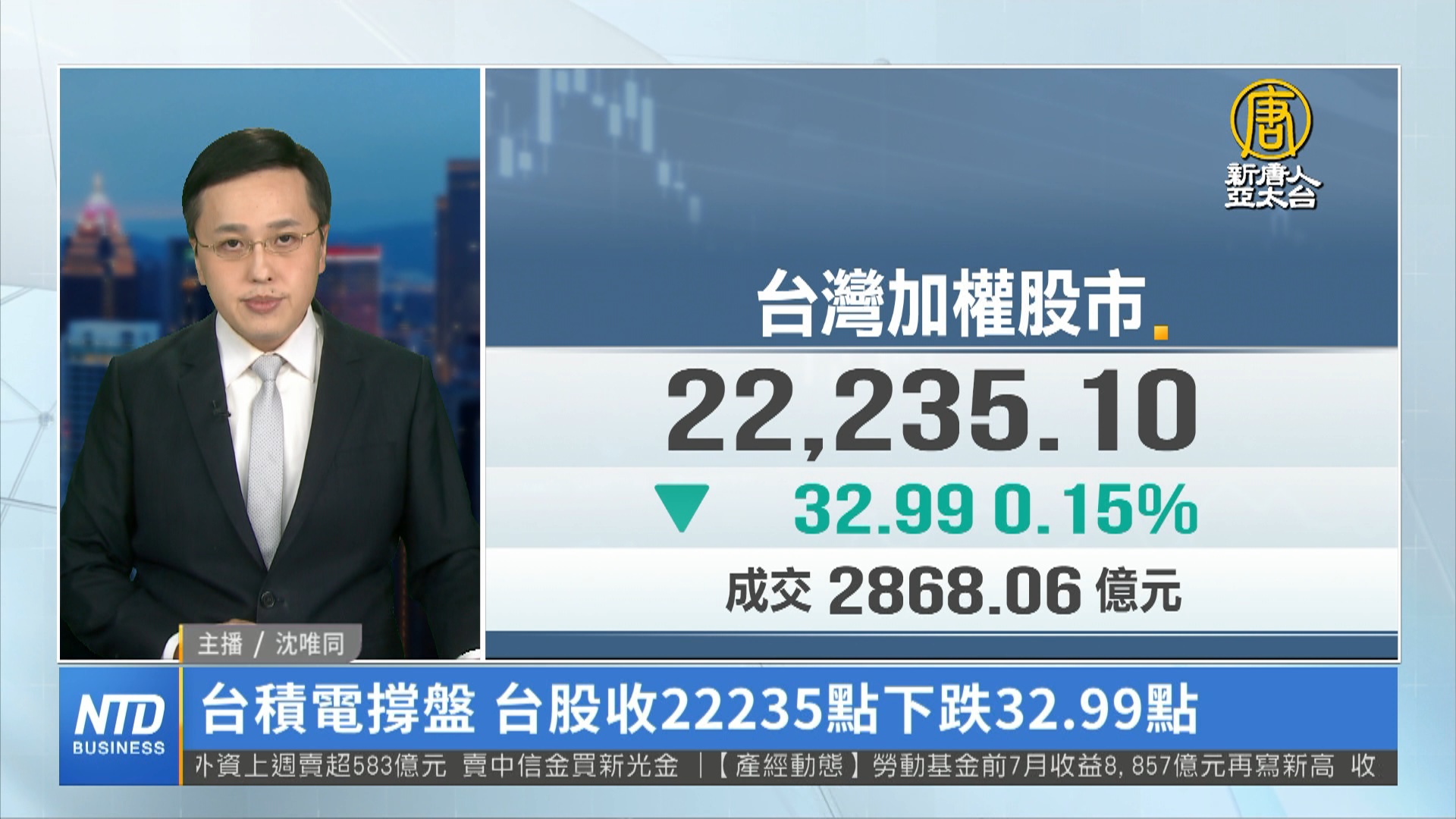 【新唐人亞太台 2024 年 09 月 02 日訊】好美國股市周五收紅,道瓊指數再創歷史新高,週一美股勞動節假期休市,電子盤期貨週一呈現震盪走低。台股今天開高走低,指數最高22439.31點,但盤中買盤力道追價無力,鴻海、聯發科兩大權值股收黑,台積電相對撐盤,尾盤上漲4元,台股終場下跌32.99點,收在22235.1點,成交值縮至新台幣2861.94億元。