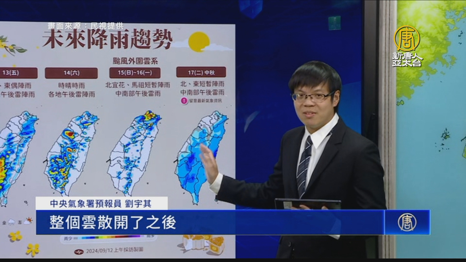 【新唐人亞太台 2024 年 09 月 12 日訊】新聞開始先來看到,下禮拜就是中秋節了,但輕颱貝碧佳來攪局,雖然不會直接影響台灣,但颱風將從週六開始通過台灣北部海域,外圍環流帶來水氣,北部、東半部地區天氣不穩定,而大家最關心的中秋賞月,看不看得到月亮,氣象署說,可能得碰碰運氣。