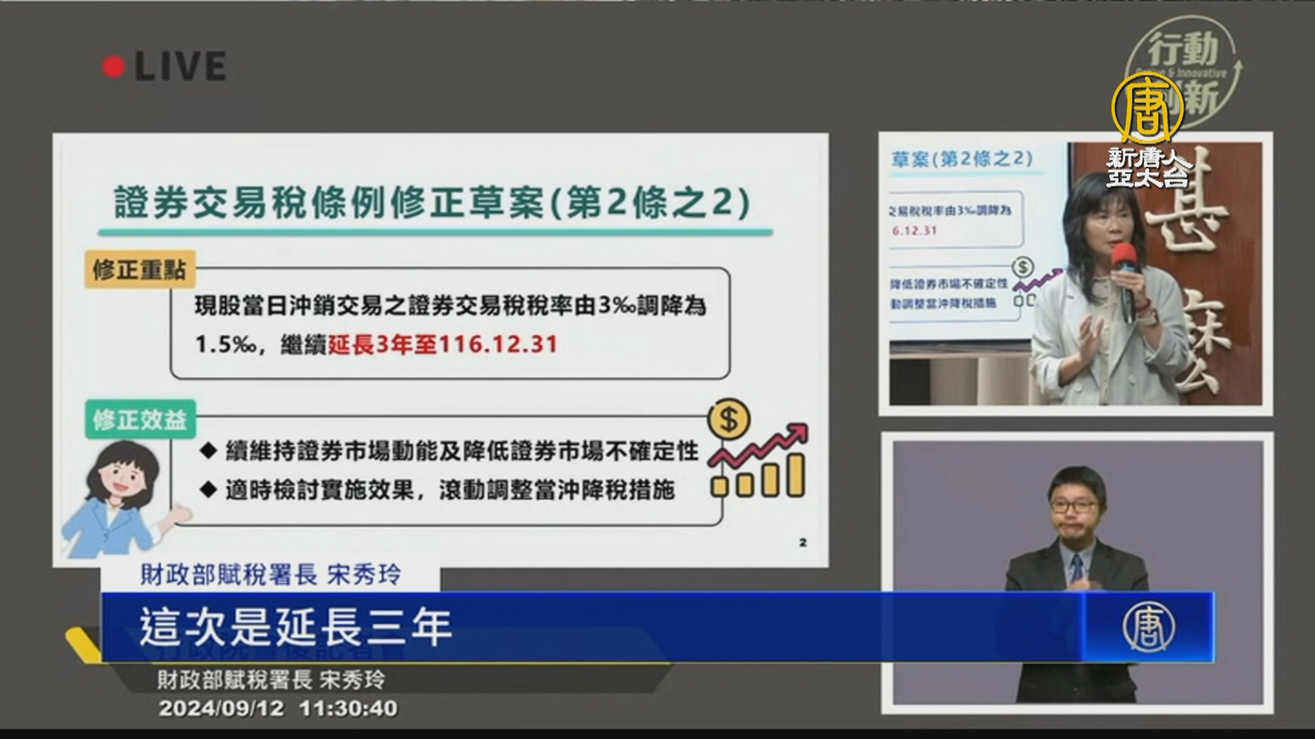 【新唐人亞太台 2024 年 09 月 12 日訊】台股當沖降稅措施,將在今年底到期,行政院會今天拍板,將再延長3年,延至2027年底。