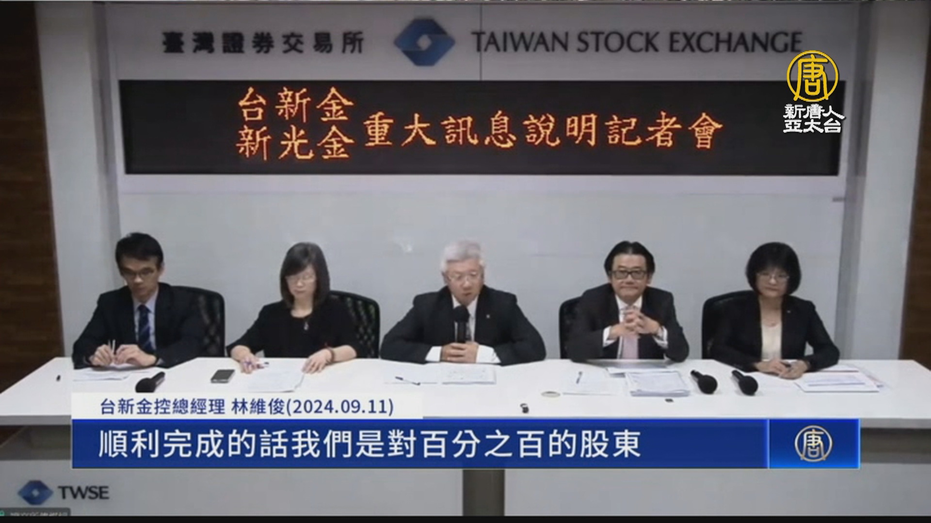 【新唐人亞太台 2024 年 09 月 12 日訊】新光金出嫁,台新金與中信金雙龍搶珠,競爭激烈,台新金在昨晚(9/11)的重訊記者會上宣布,調高換股比率,相當於用14.18元娶親新光金,也呼籲主管機關,不應該讓惡意併購,擾亂金融市場秩序。提高換股價格消息出爐後,台新金、新光金今天股價開盤重挫,不過買盤持續湧入,收盤下跌1.08%與1.48%。