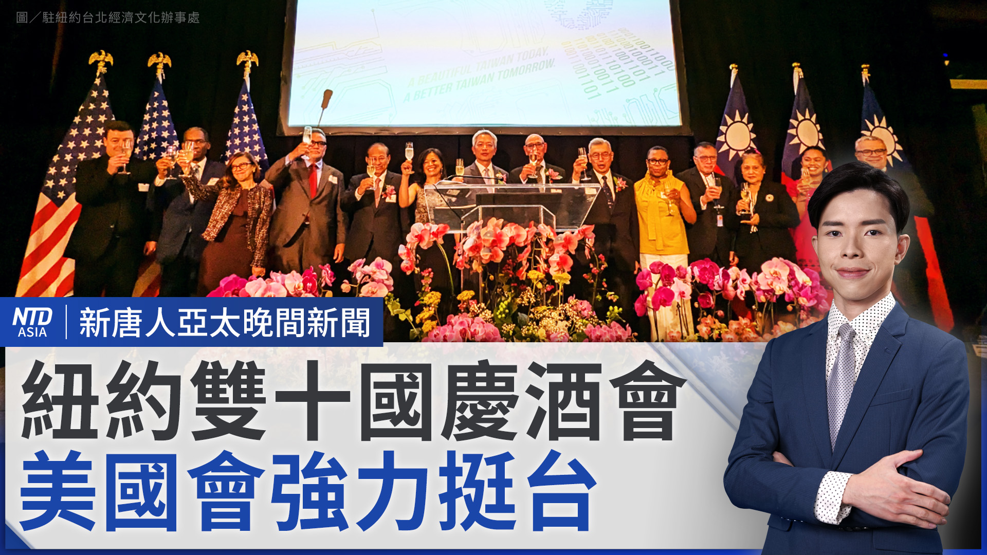 記者:「這裡是紐約曼哈頓的文華東方酒店,駐紐約台北經濟文化辦事處今晚舉辦了中華民國113年國慶酒會。許多政要、僑界領袖以及友邦代表出席,共同慶祝這一盛會。」