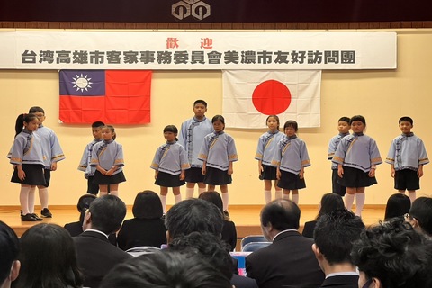 高市客家兒童到日本岐阜縣美濃市役所交流演唱,會場懸掛台日國旗,顯示兩國堅定友誼(高雄客委會 提供)