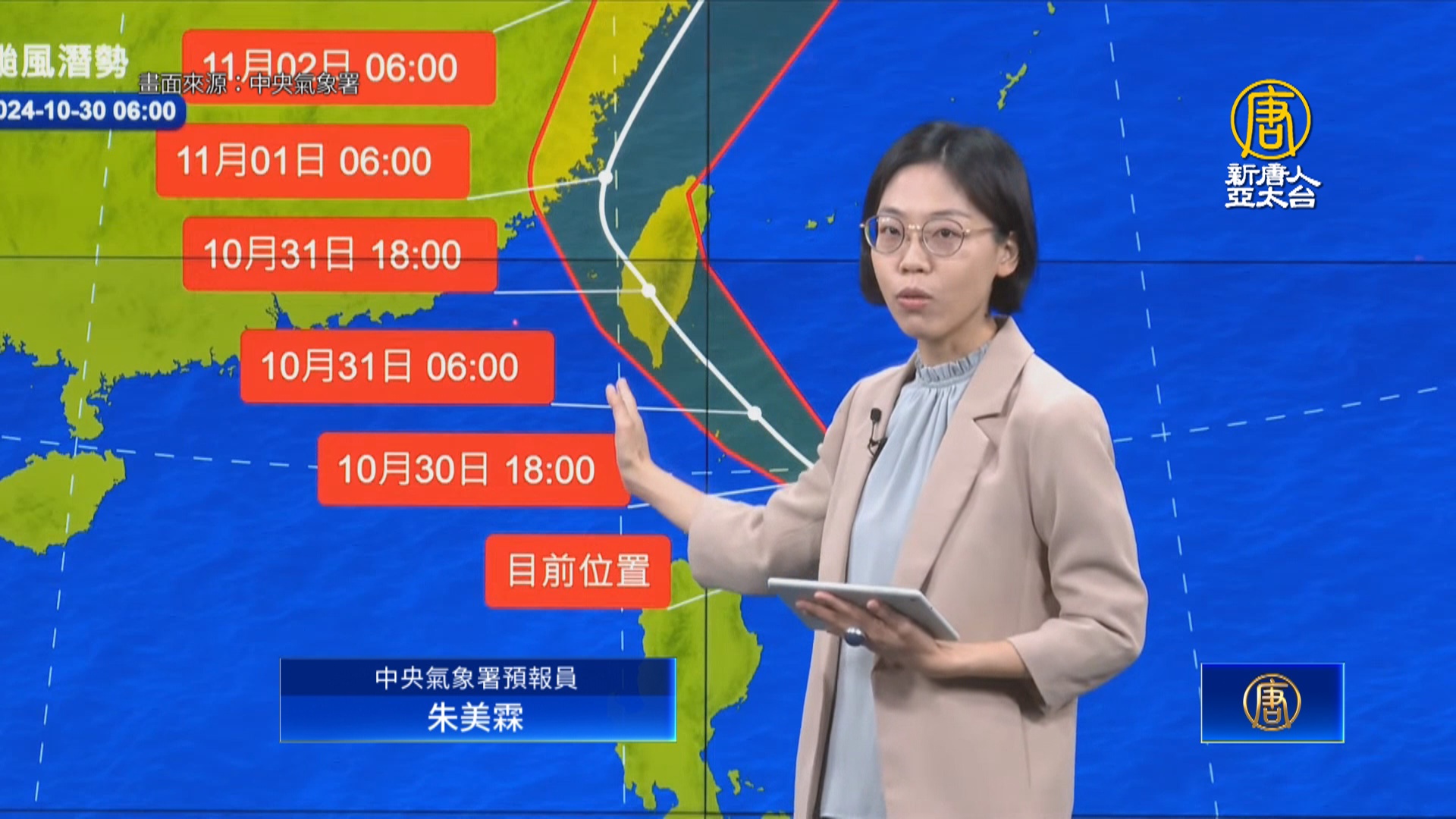 【新唐人亞太台 2024 年 10 月 30 日訊】早安新唐人先來關心,中央氣象署今天清晨5點半,發布中度颱風康芮海上陸上颱風警報,首波陸警區域為台東、恆春半島。預計,康芮暴風圈今天深夜接觸台灣陸地,明天下半天,從東半部至恆春登陸,暴風圈籠罩全台,今起到週五清晨,各地都須嚴防強風豪雨。來看氣象署的最新說明。
