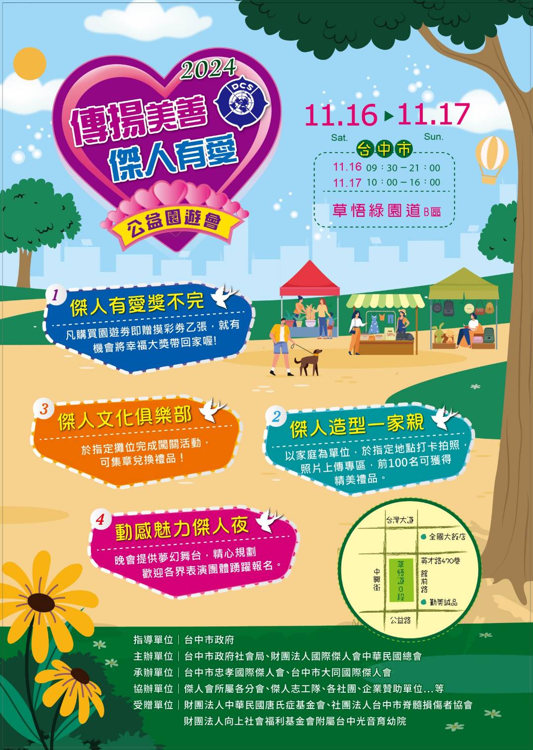國際傑人會與台中市政府社會局,11月16、17日兩天,在台中草悟道B段,舉辦「傳揚美善、傑人有愛-公益愛心園遊會」(圖/國際傑人會)